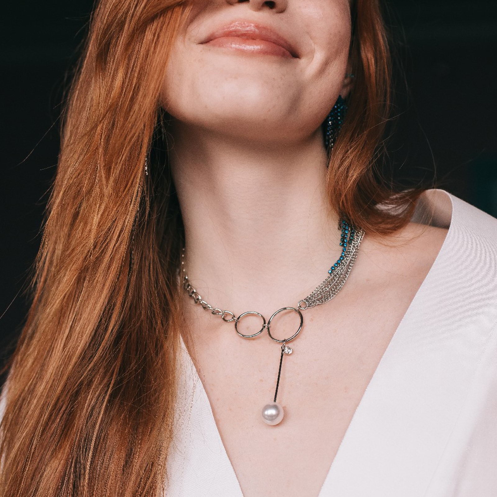 Кулон с жемчугом "Цепь" звено, 32 см, белый в серебре, 2.5x32x1.2 см., QF, Китай