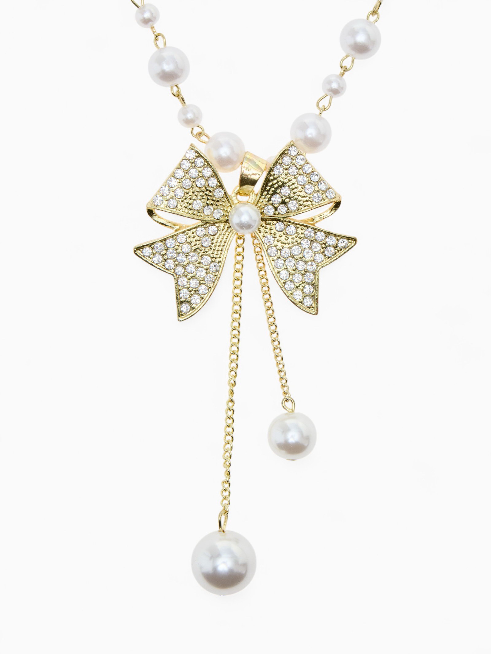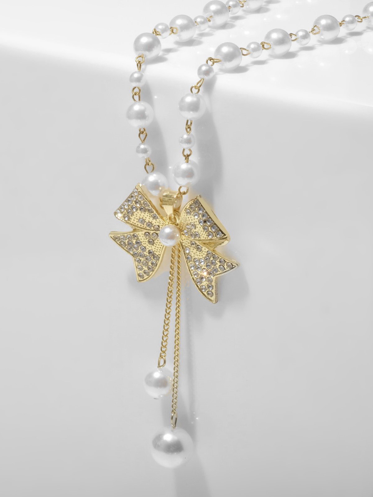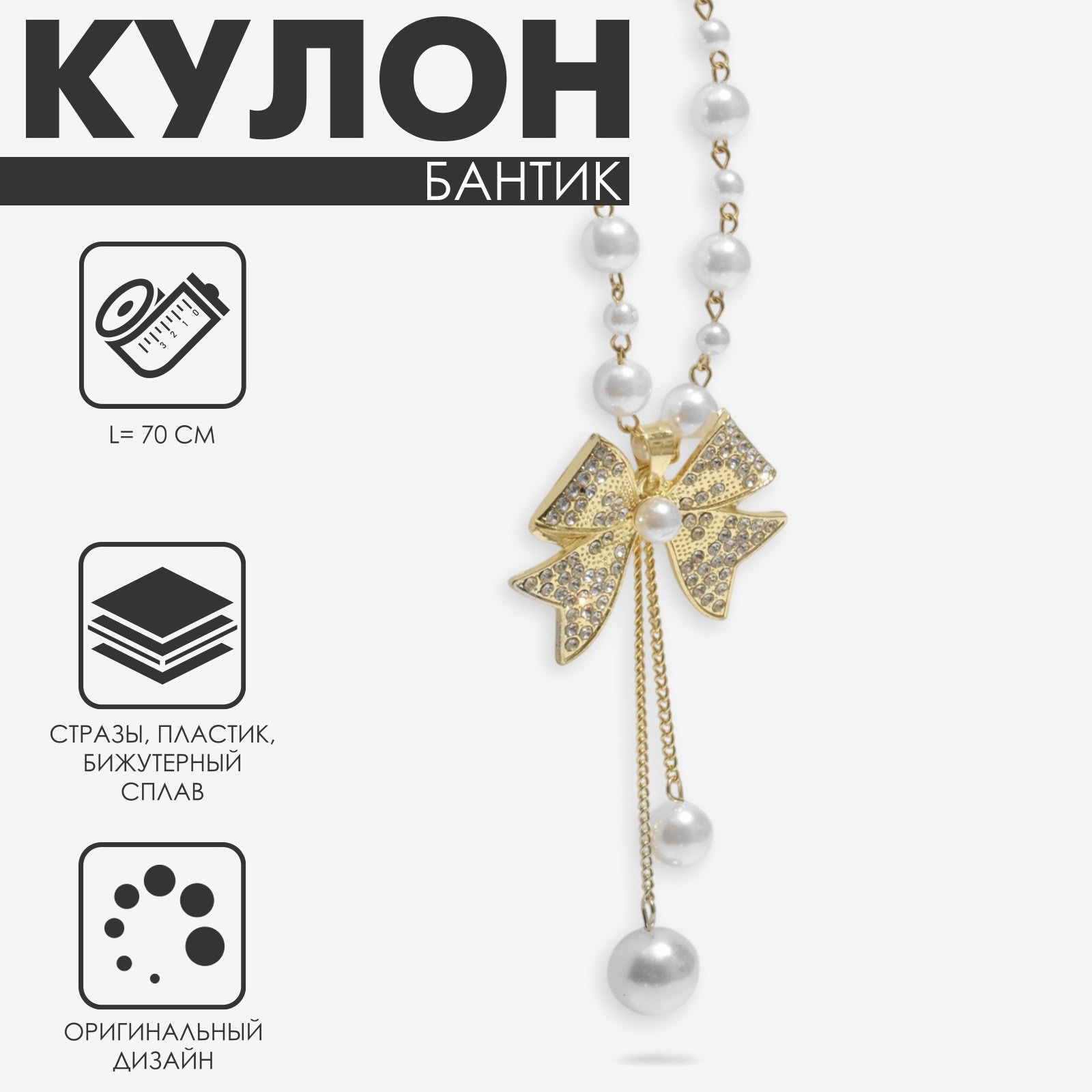 Кулон с жемчугом "Крупный бантик", белый в золоте, 70 см, 10x70x3 см., QF, Китай