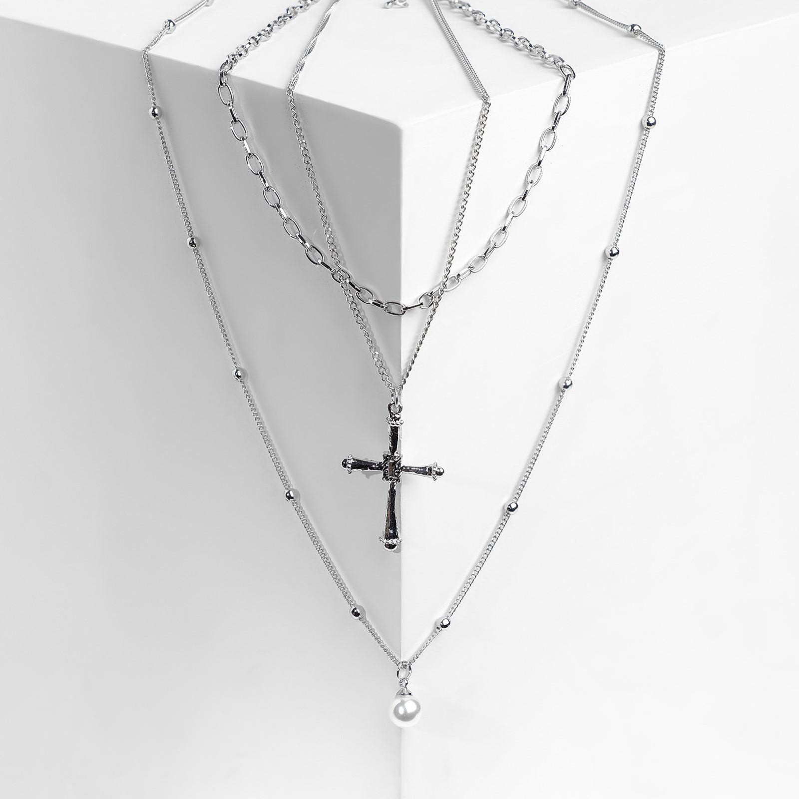 Кулон "Цепь" крест с жемчугом, цвет белый в серебре, L=60 см, 13x60x2.5 см., QF, Китай