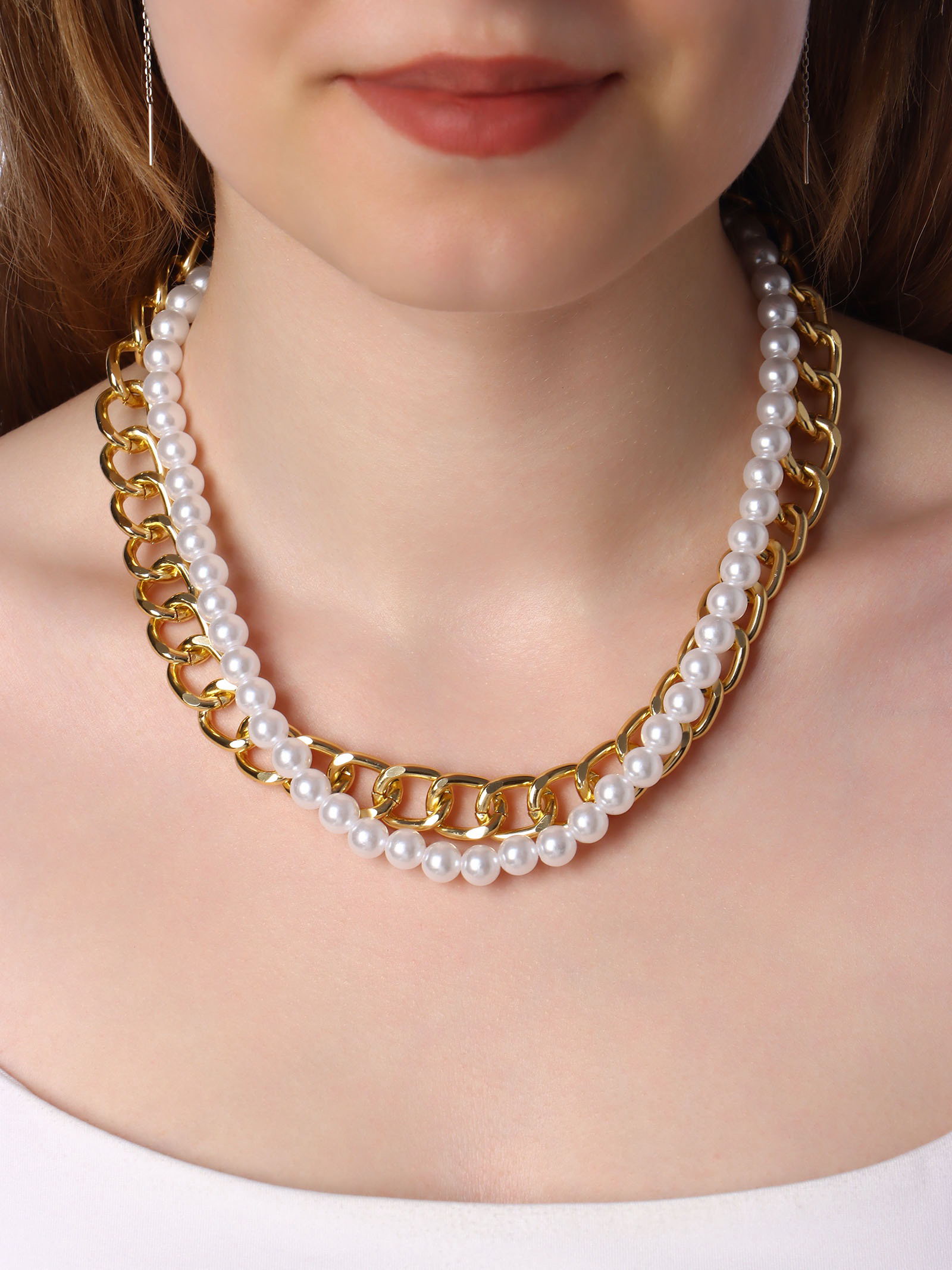 Колье "Цепь" с жемчугом, белое в золоте, 1.5x32x1 см., QF, Китай