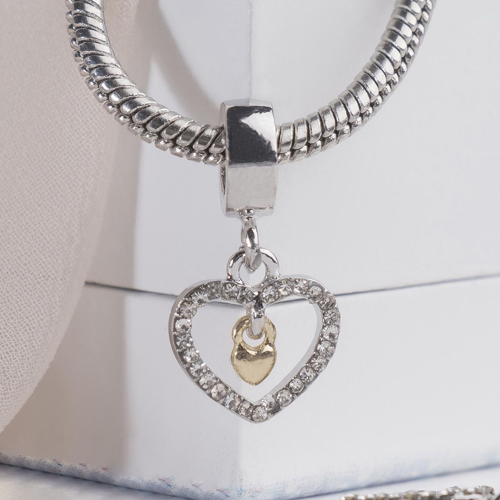 Шарм подвеска "Сердце в сердце", цвет бело-золотой в серебре, 1.2x2.5x0.7 см., QF, Китай
