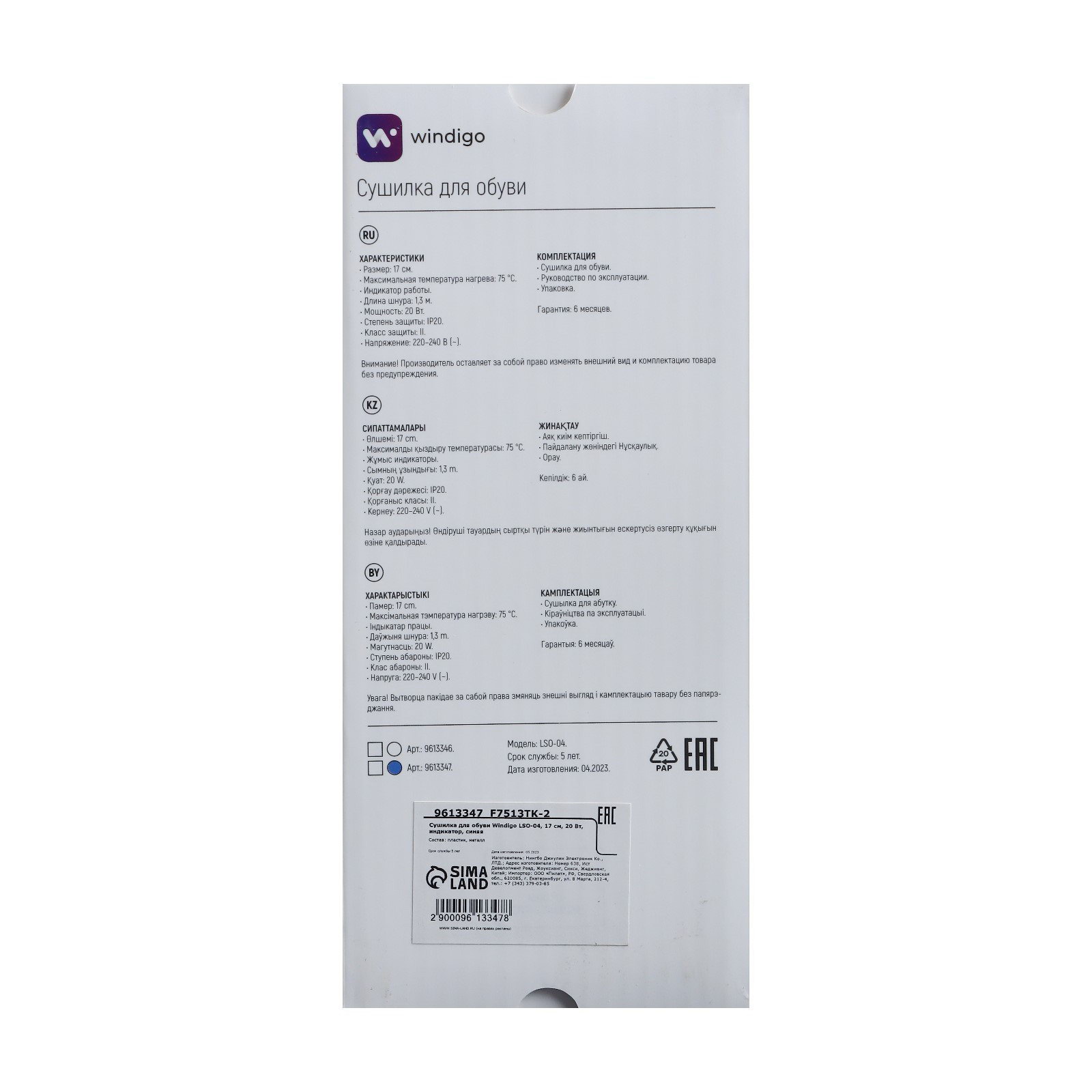 Сушилка для обуви LSO-04, 17 см, 20 Вт, индикатор, синяя, 7.1x17x2.9 см., Windigo, Китай