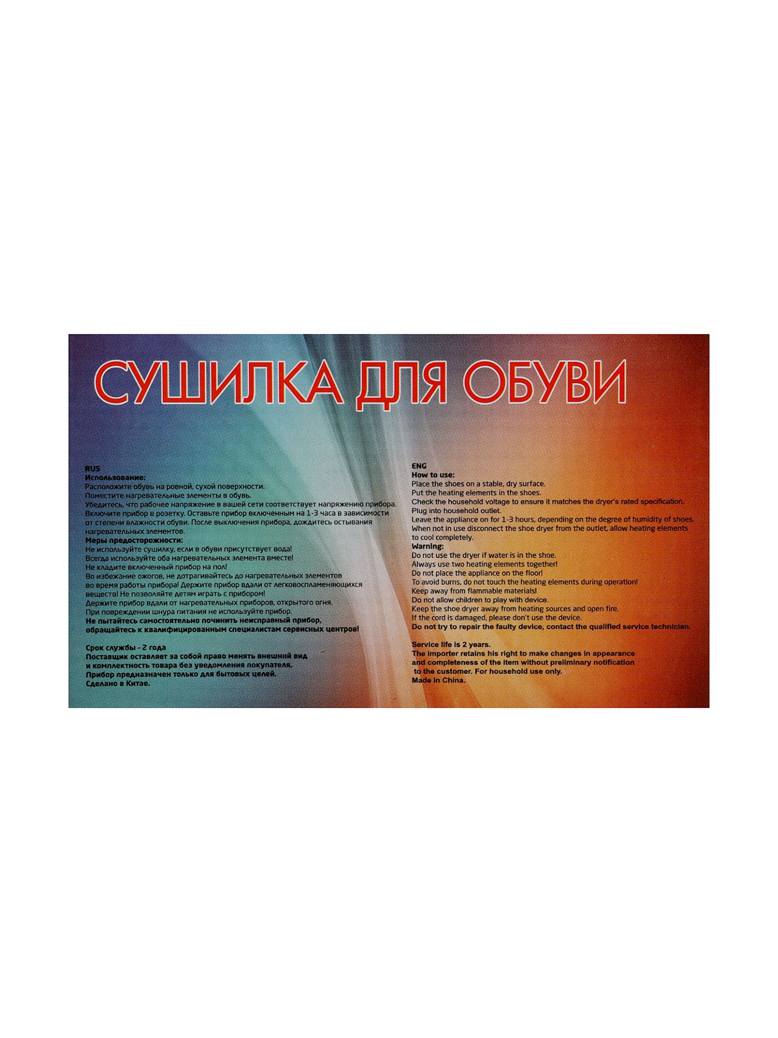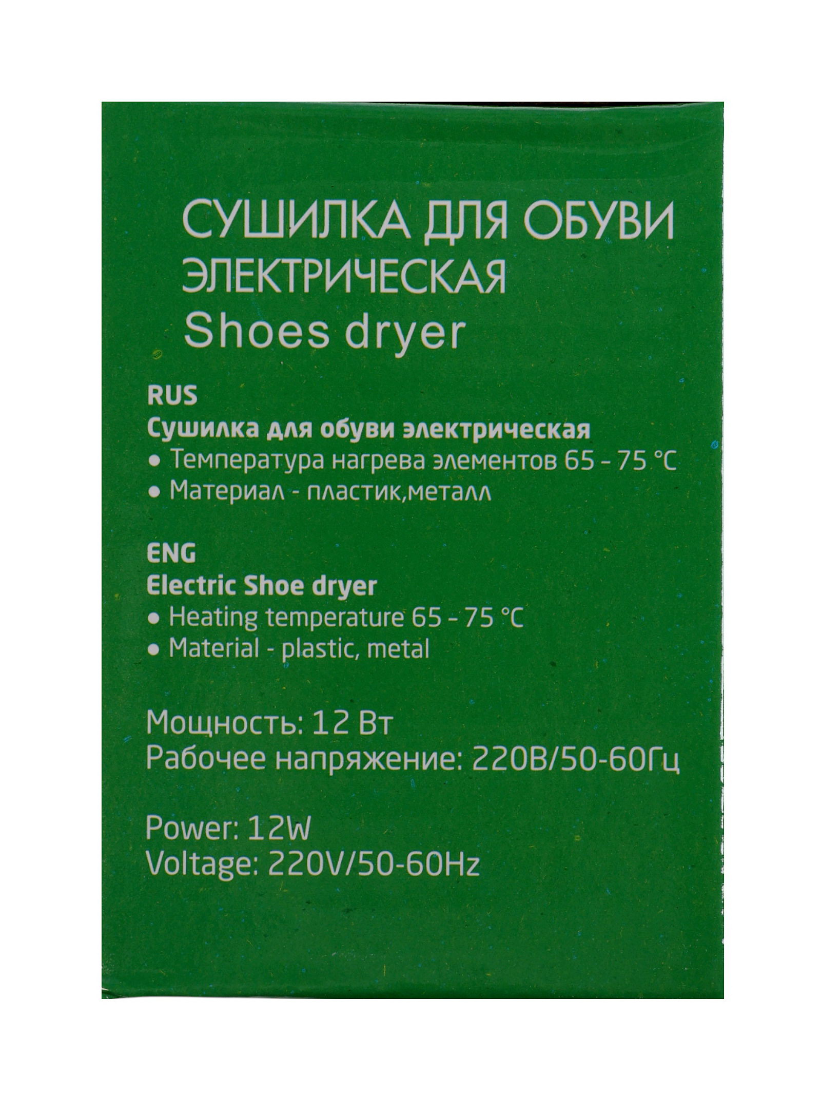 Размер упаковки: 6 x 6 x 14 см. Гарантийный срок, мес.: 6 tnved: 8516797000 Цвет: Красный Мощность, Вт: 12 Длина сушилки, см: 10 Компактная сушилка мощностью 12 Вт создана специально для детской обуви длиной до 10 см и выделяется ярким красным цветом, который добавит энергии и настроения в повседневный уход за обувью. Устройство оснащено индикатором работы, что позволяет легко контролировать процесс сушки и быть уверенным в безопасности эксплуатации. Благодаря оптимальной мощности сушилка быстро и бережно избавляет обувь от влаги, предотвращая появление неприятного запаха и развитие микробов. Её компактные размеры обеспечивают удобное хранение и транспортировку, а надёжная конструкция гарантирует длительный срок службы.
