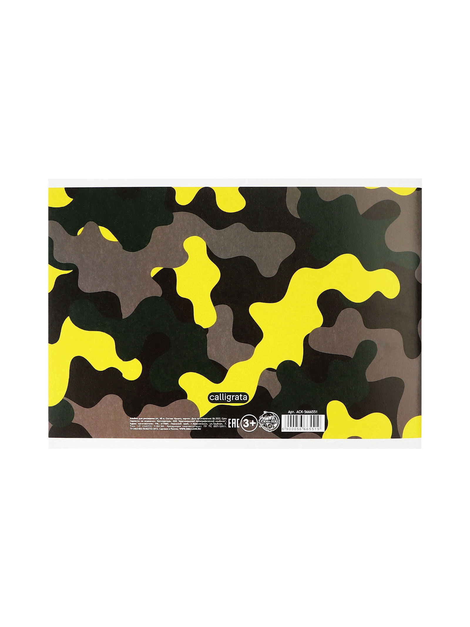 Размер упаковки: 20 x 0.8 x 29 см. Для кого: Для мальчика Твёрдая подложка: Нет tnved: 4820900000 Штрихкод на единице товара: Да Материал обложки: Мелованный картон Цвет: Камуфляж Количество листов: 40 Тип скрепления: На скобе Плотность, г/?2: 100 Формат: А4 Отделка: Без отделки Белизна блока, %: 95-100 Вид живописи: Для рисования Линовка блока: Без линовки Европодвес: Нет Лицензия: Нет Набор: Нет Температурное ограничение транспортировки: Нет Вид обложки: Мягкая Температурное ограничение: Нет Этот альбом для рисования с камуфляжным принтом создан для смелых творческих идей. Плотная бумага и дерзкий дизайн обложки поддерживают дух экспериментов с красками и карандашами. Конструкция для творчества