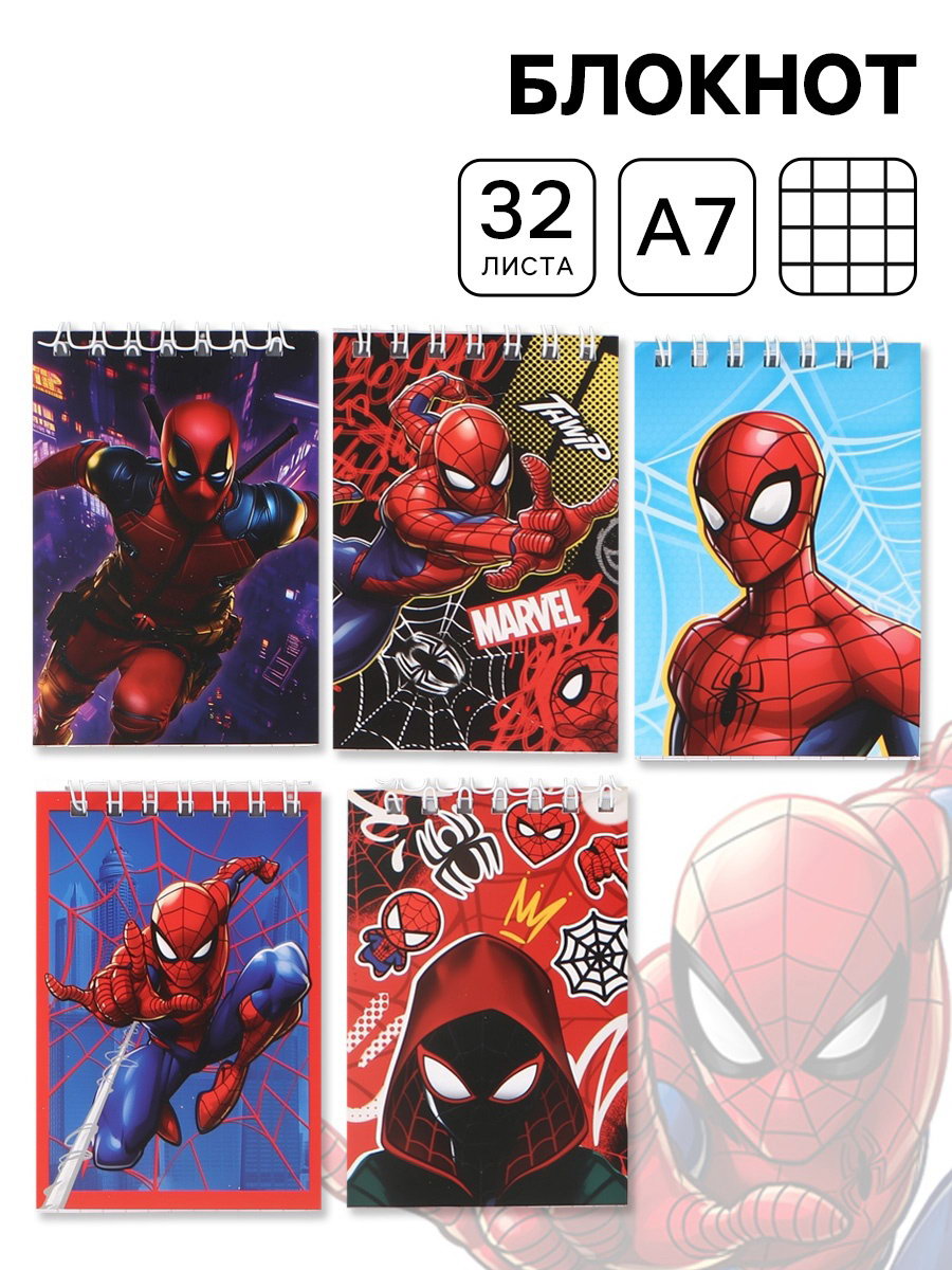 Блокнот А7, 32 л, на гребне 5 видов, МИКС Человек паук, MARVEL, Россия