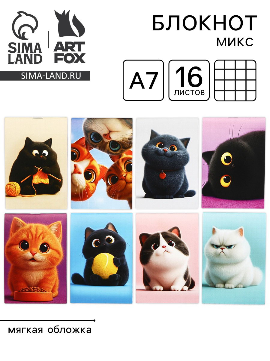 Блокнот А7, 16 л "Котики" МИКС, ArtFox, Россия