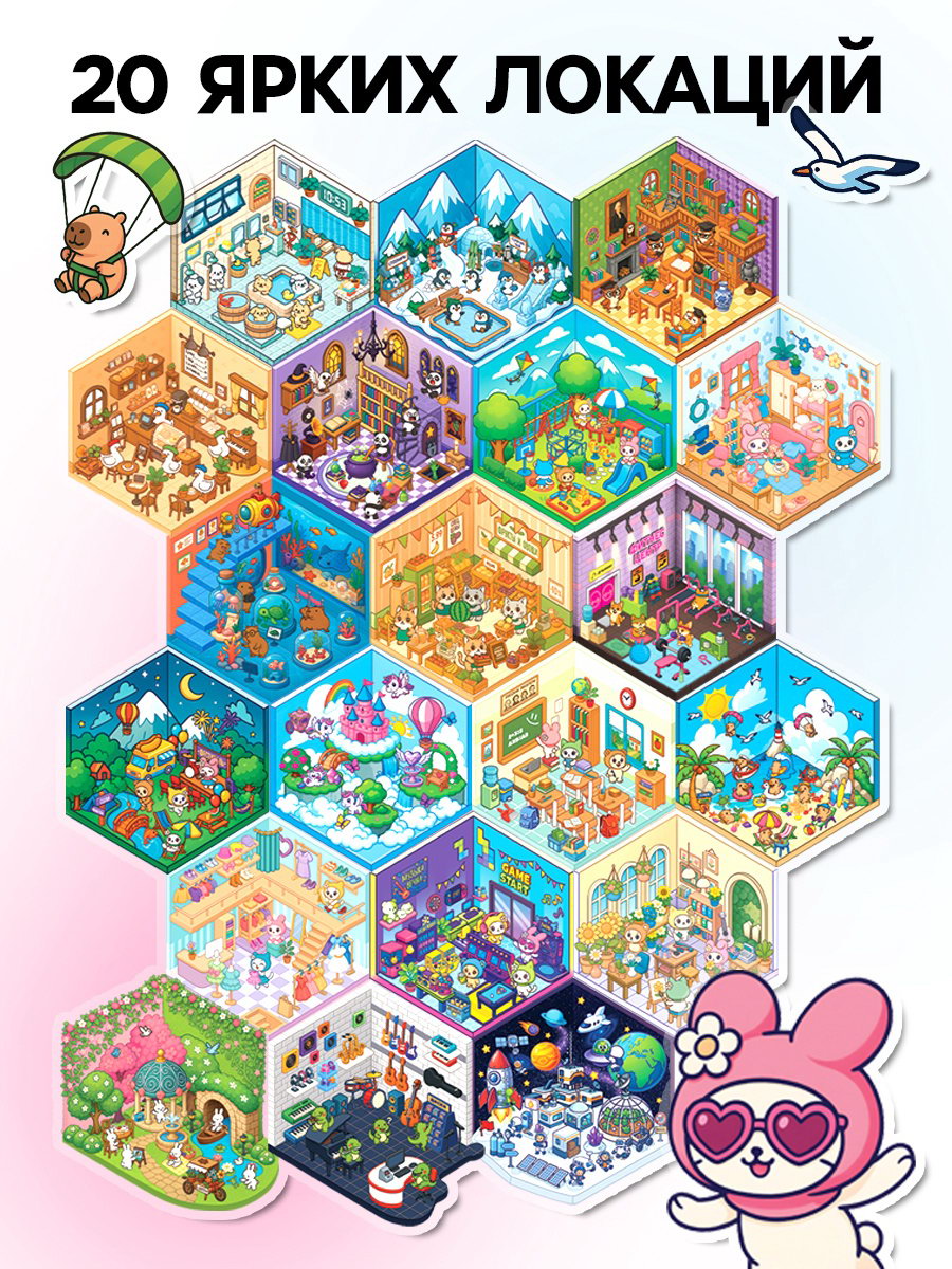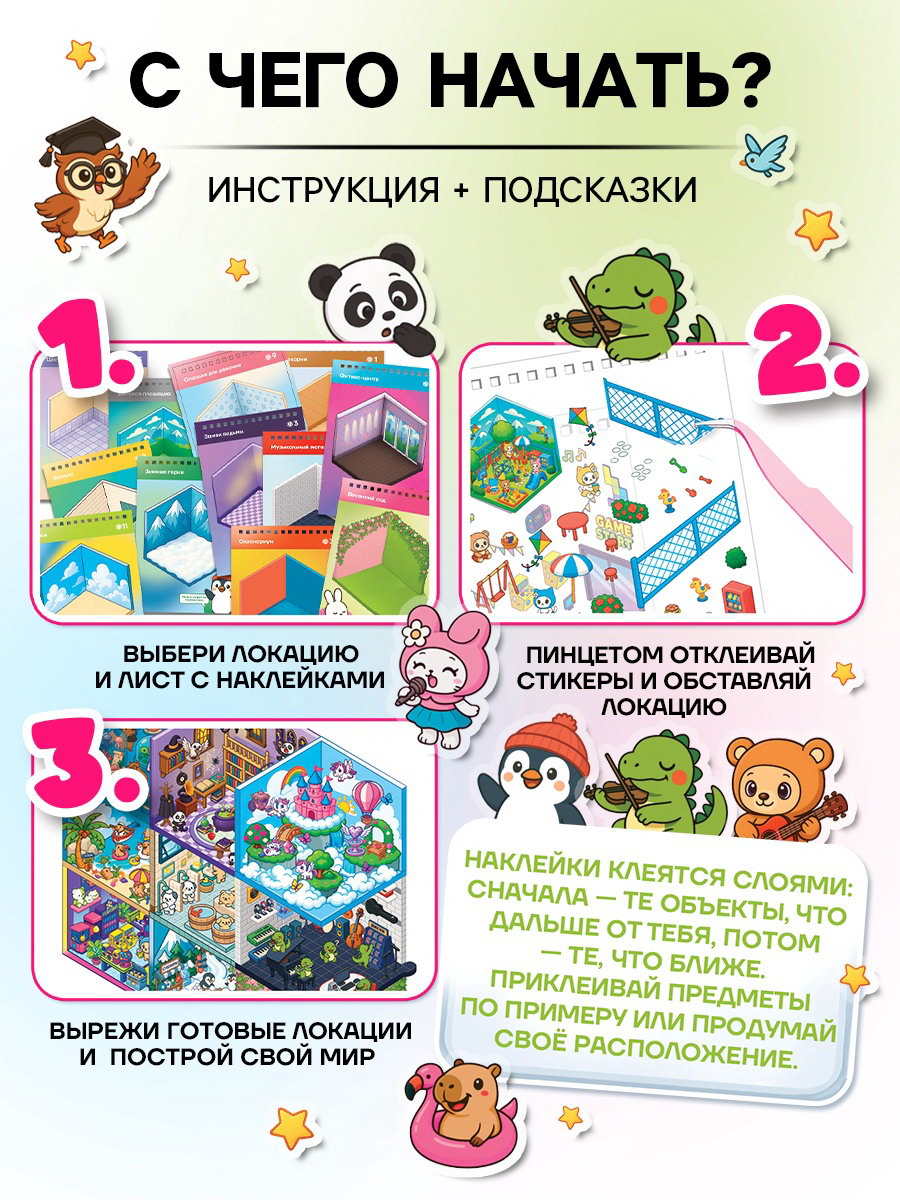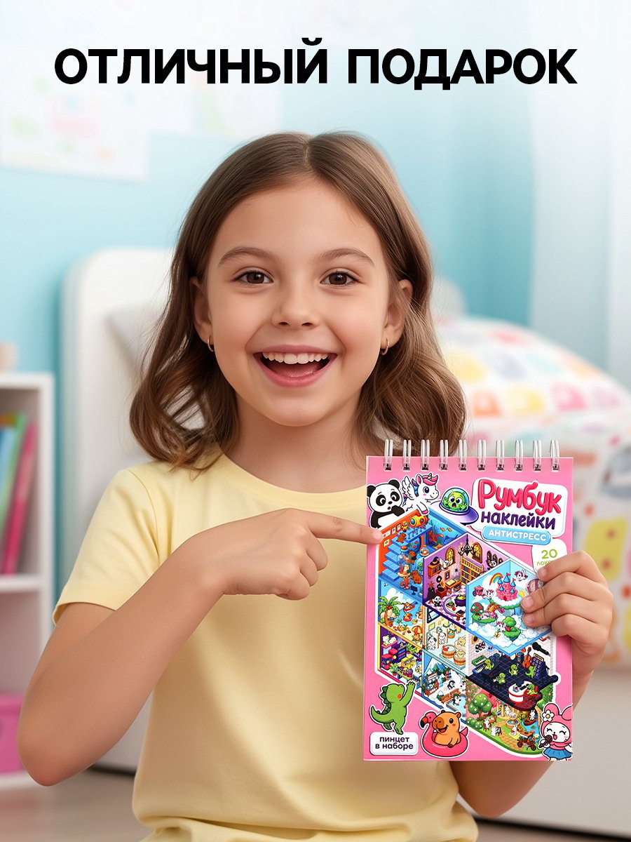 На страницах с наклейками есть готовый образец дизайн комнаты, который можно повторить или изменить по своему вкусу. Наклеивание деталей успокаивающее занятие, которое развивает внимание и креативность. Подходит детям и взрослым. | ||