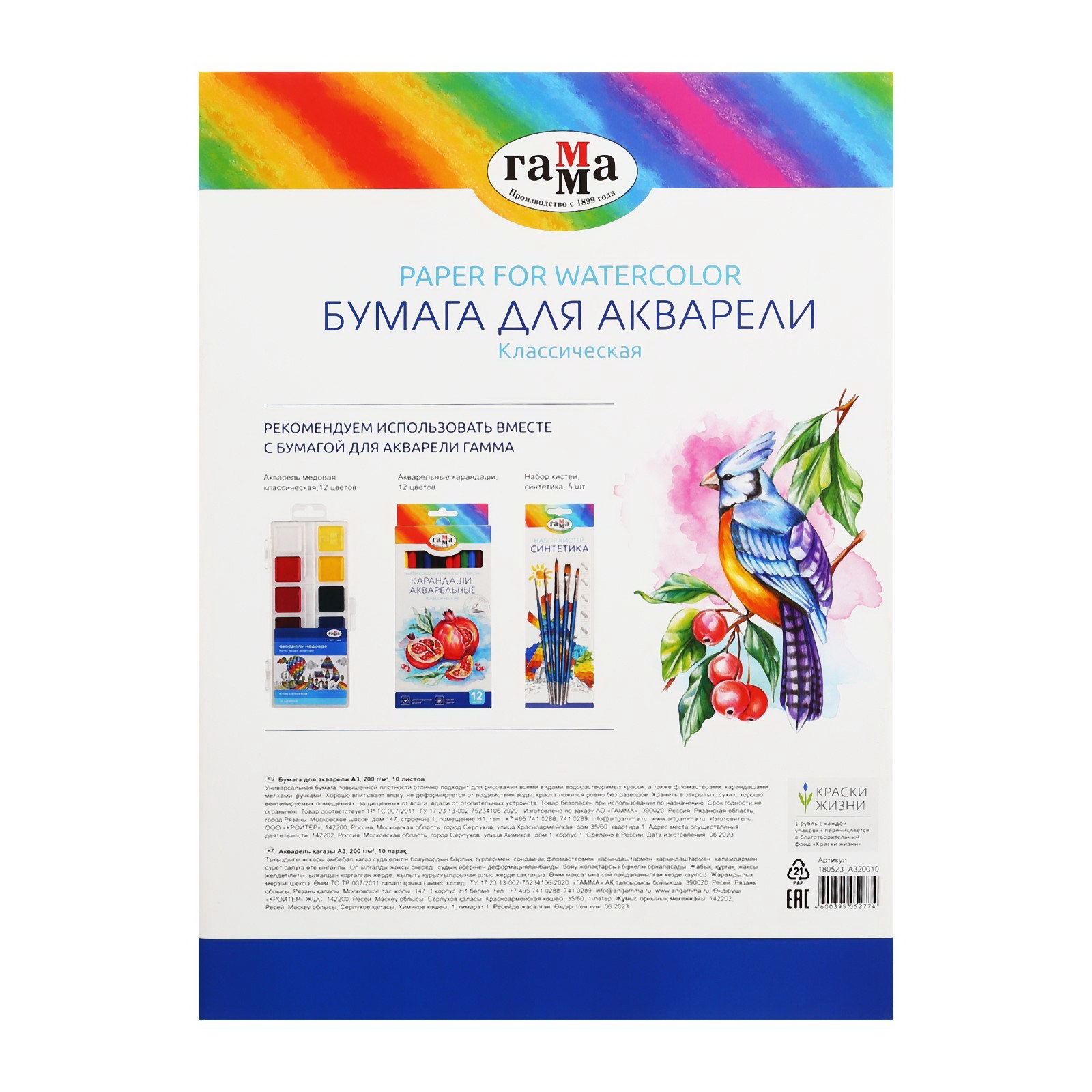 Размер упаковки: 30.5 x 0.3 x 42 см. Реестр Минпромторга: Нет Особенности основы бумаги: 100% Целлюлоза tnved: 4802562000 Температурное ограничение: Нет Цвет: Белый Количество листов: 10 Тип скрепления: В папке Формат: А3 Плотность, г/?2: 200 Фактура бумаги: Лёгкое зерно Акварельная бумага ГАММА серии "Классическая" состоящая из 10 листов плотностью 200 г/м2 отлично походит для рисования всеми видами водорастворимых красок, а также фломастерами и карандашами, мелками, ручками. Бумага, благодаря тому, что изготовлена из 100% целлюлозы, хорошо впитывает влагу, не деформируется от воздействия воды, краска ложится ровно без разводов. Акварельная бумага серии "Классическая" обладает зернистой структурой, что позволяет использовать разные техники рисования и прорабатывать мелкие детали. | ||