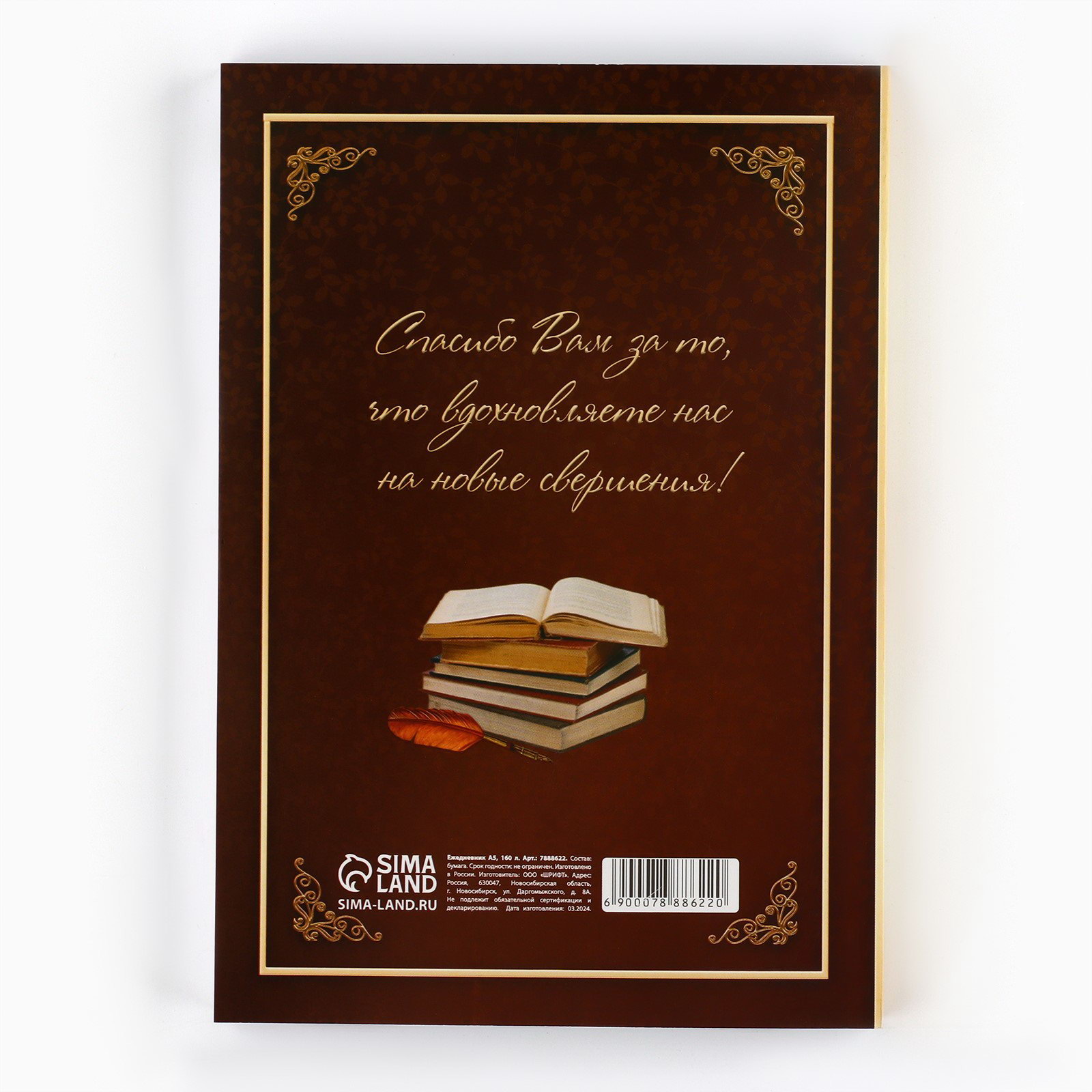 Размер упаковки: 14 x 19.5 x 1.3 см. Дизайн обложки: С рисунком Тип ежедневника: Недатированный Плотность, г/?2: 80 Штрихкод на единице товара: Да Белизна блока, %: 95-100 Для кого: Для женщины Тематика праздника: День учителя Тип скрепления: На склейке Отделка: Без отделки tnved: 4820109000 Адресат: Учителю Формат: А5 Цвет: Коричневый Рисунок: Да Количество листов: 160 Материал обложки: Картон Вид обложки: Мягкая Ежедневник отлично подойдет в качестве подарка. Яркий дизайн несомненно привлечет внимание и будет выделяться , а удобный формат позволит использовать с комфортом. • Пиши • Планируй • Выполняй