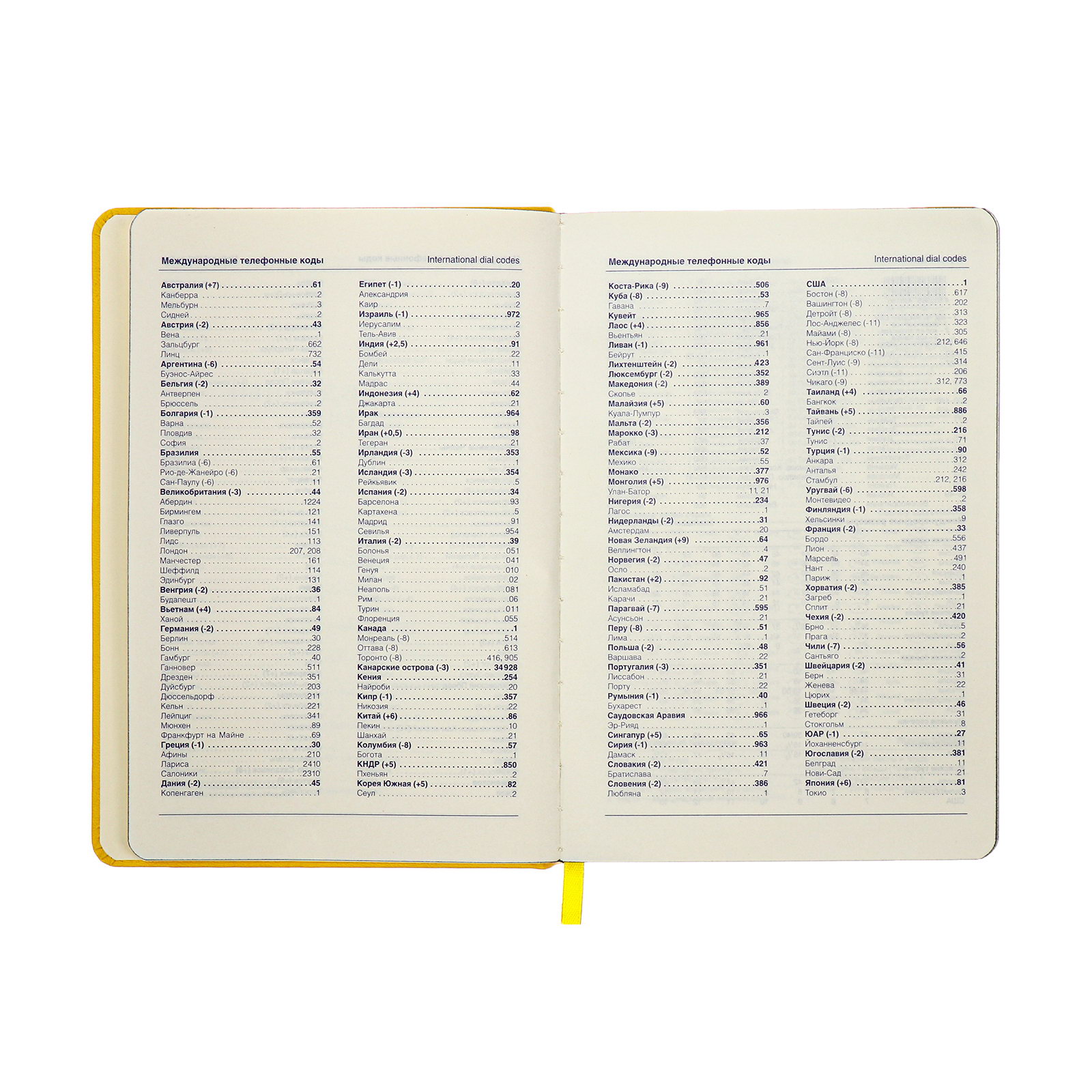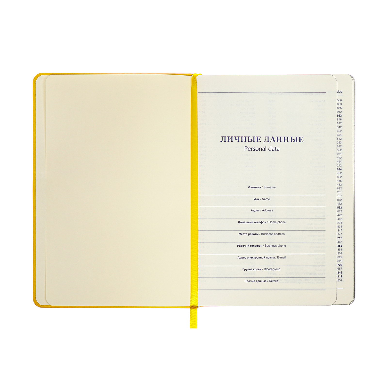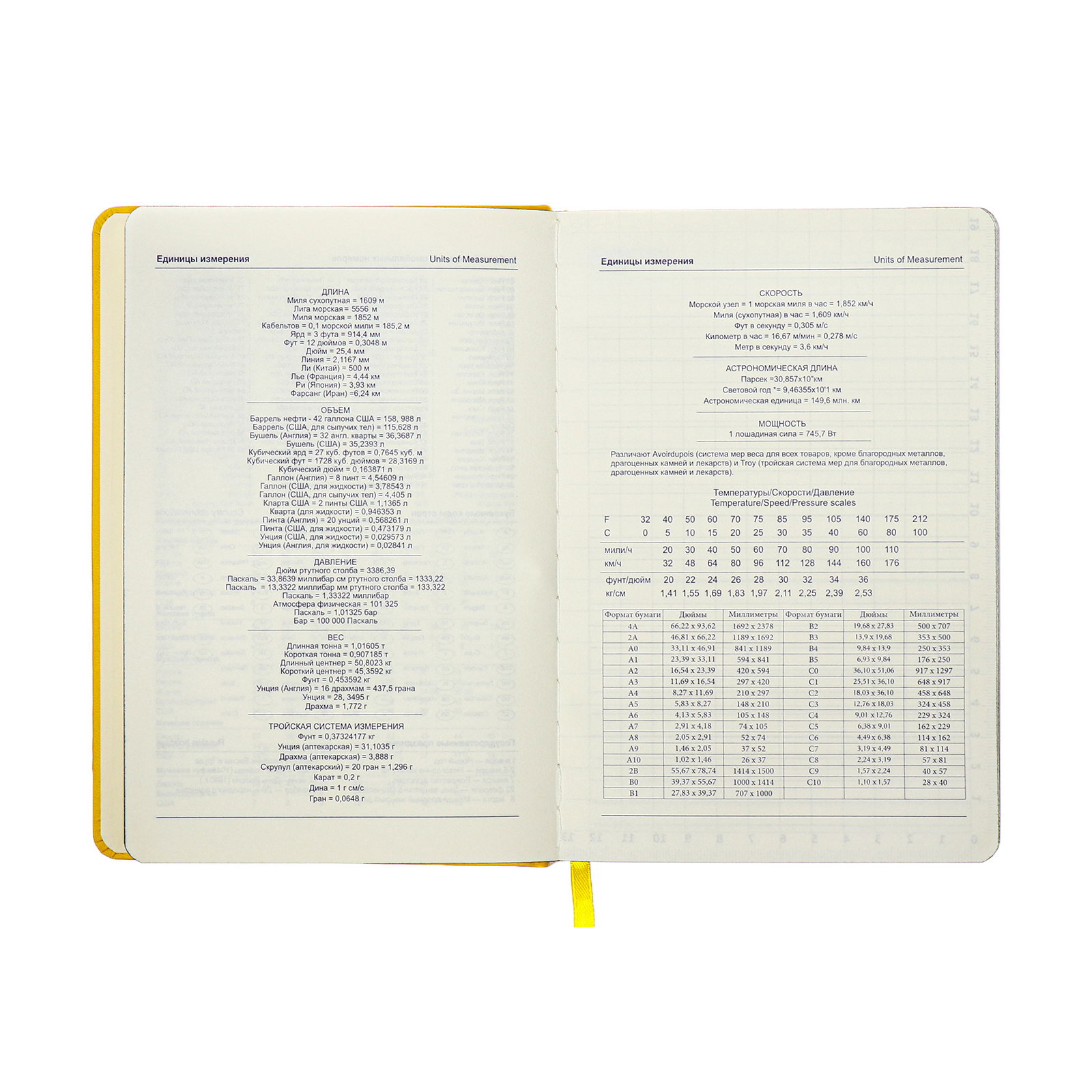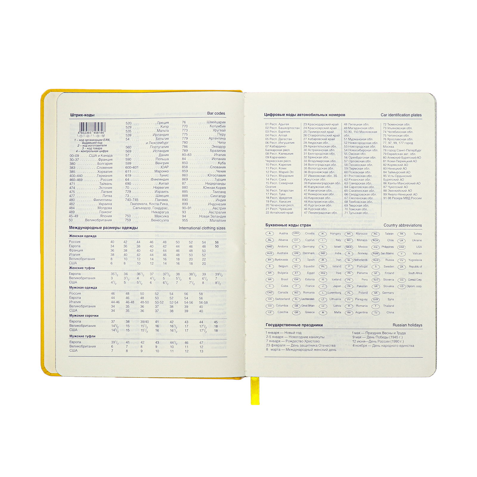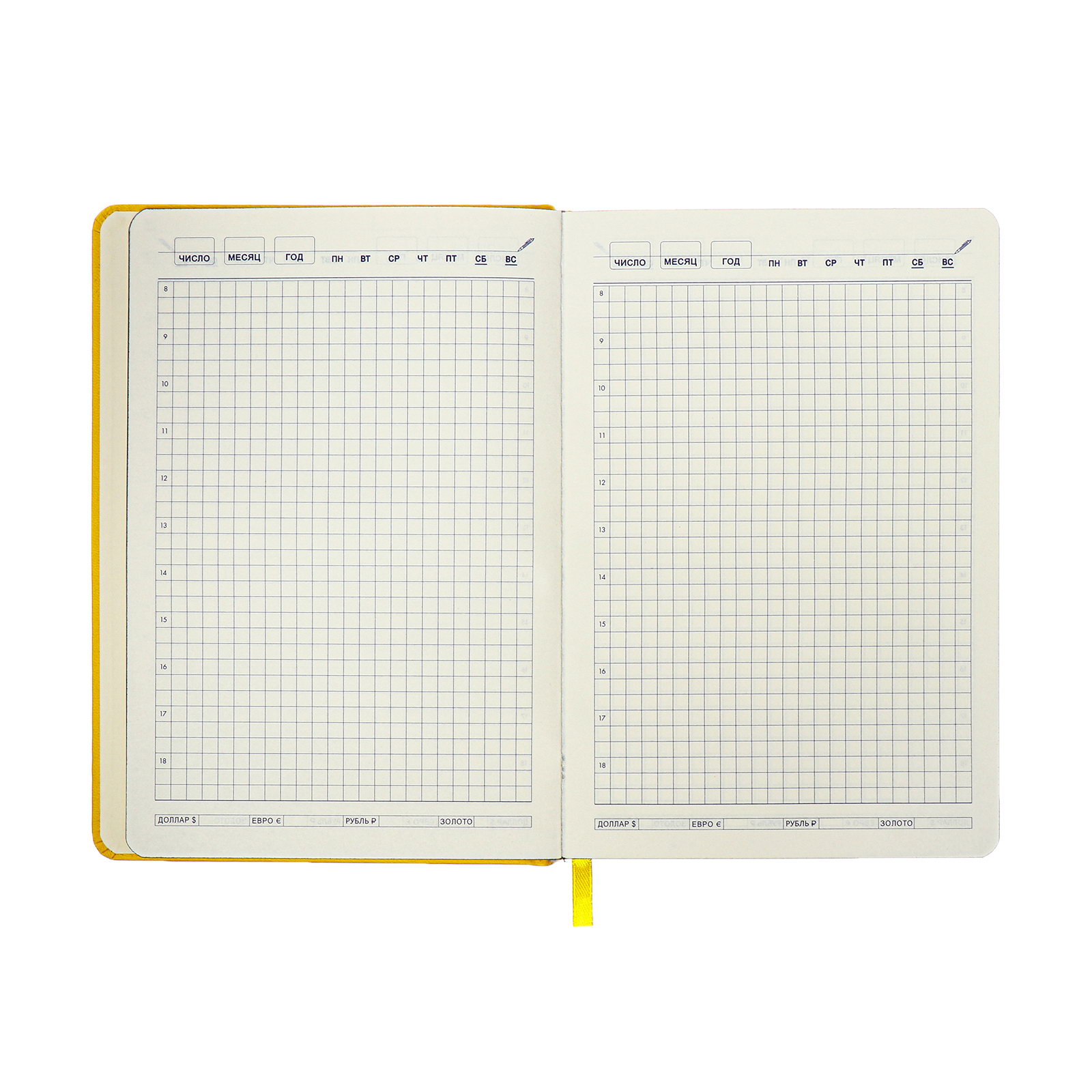 Особенности: Ляссе, На резинке, Со справочной информацией, Цветной срез Размер упаковки: 14 x 2 x 21 см. Рисунок: Нет Количество листов: 140 Цвет: Жёлтый Материал обложки: Искусственная кожа Формат: А5 Адресат: Без адресата tnved: 4820103000 Тип ежедневника: Недатированный Тип скрепления: Сшивной Линовка блока: Клетка Дизайн обложки: Однотонный Недатированный ежедневник формата А5 с искусственной кожей в однотонном дизайне сочетает стиль и практичность. Сшивной блок на 140 страниц в клетку создаёт удобное пространство для записей, планирования задач и фиксации идей. Жёлтый цветной срез, резинка и ляссе помогают сохранять порядок и быстро ориентироваться в нужных страницах. Встроенная справочная информация делает ежедневник универсальным для работы, учёбы и личных заметок. Особенности