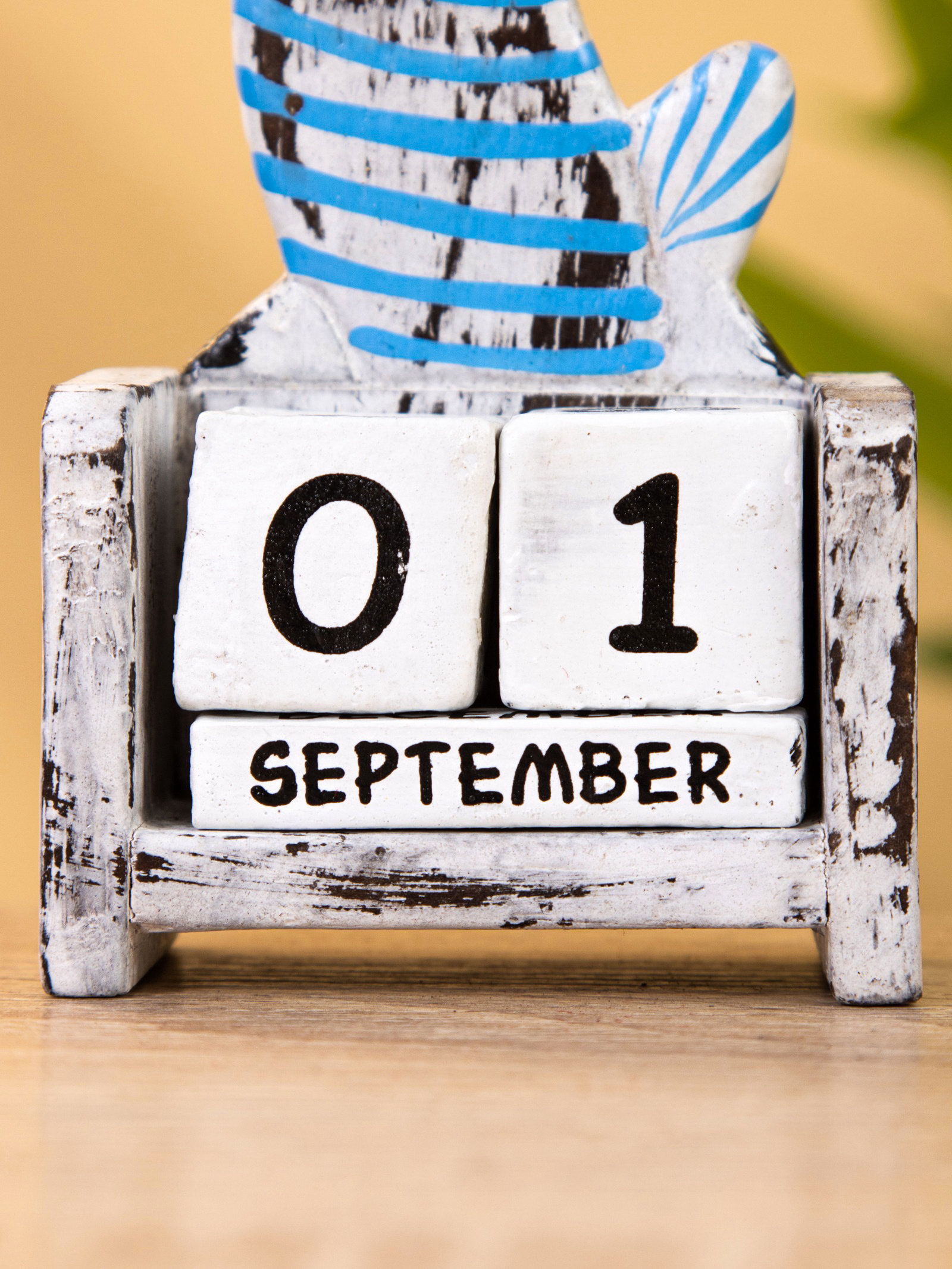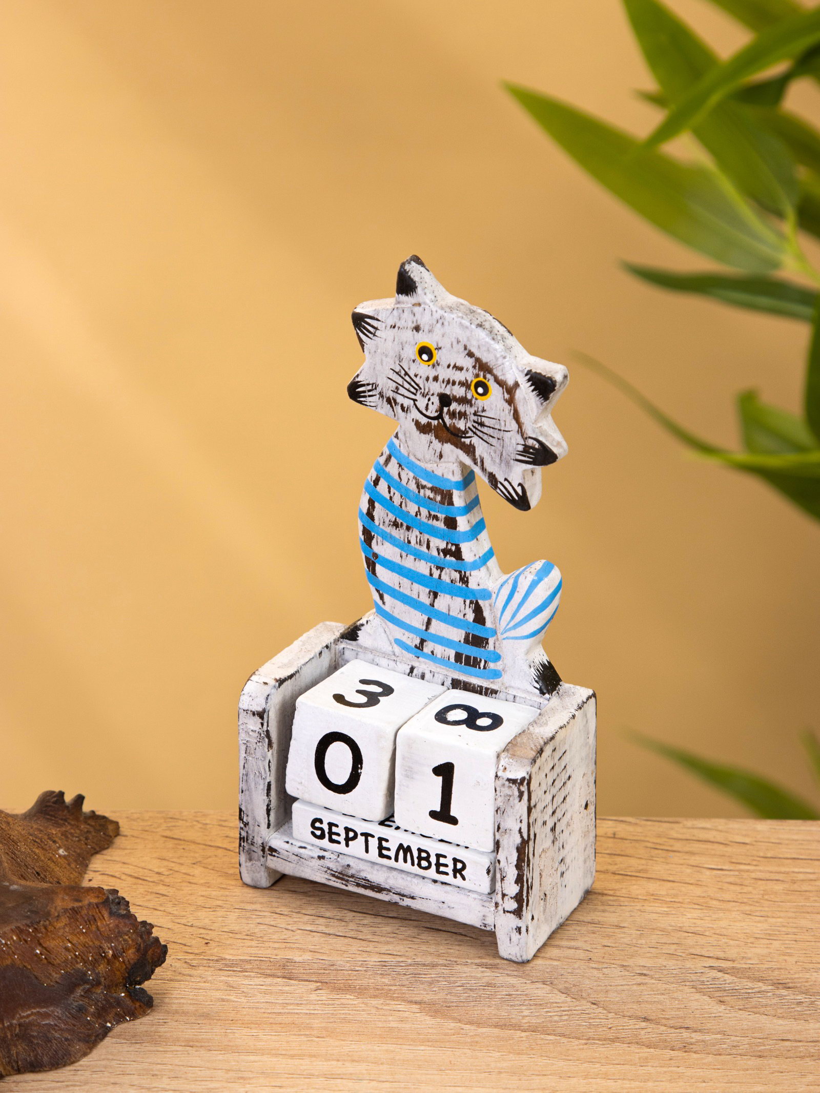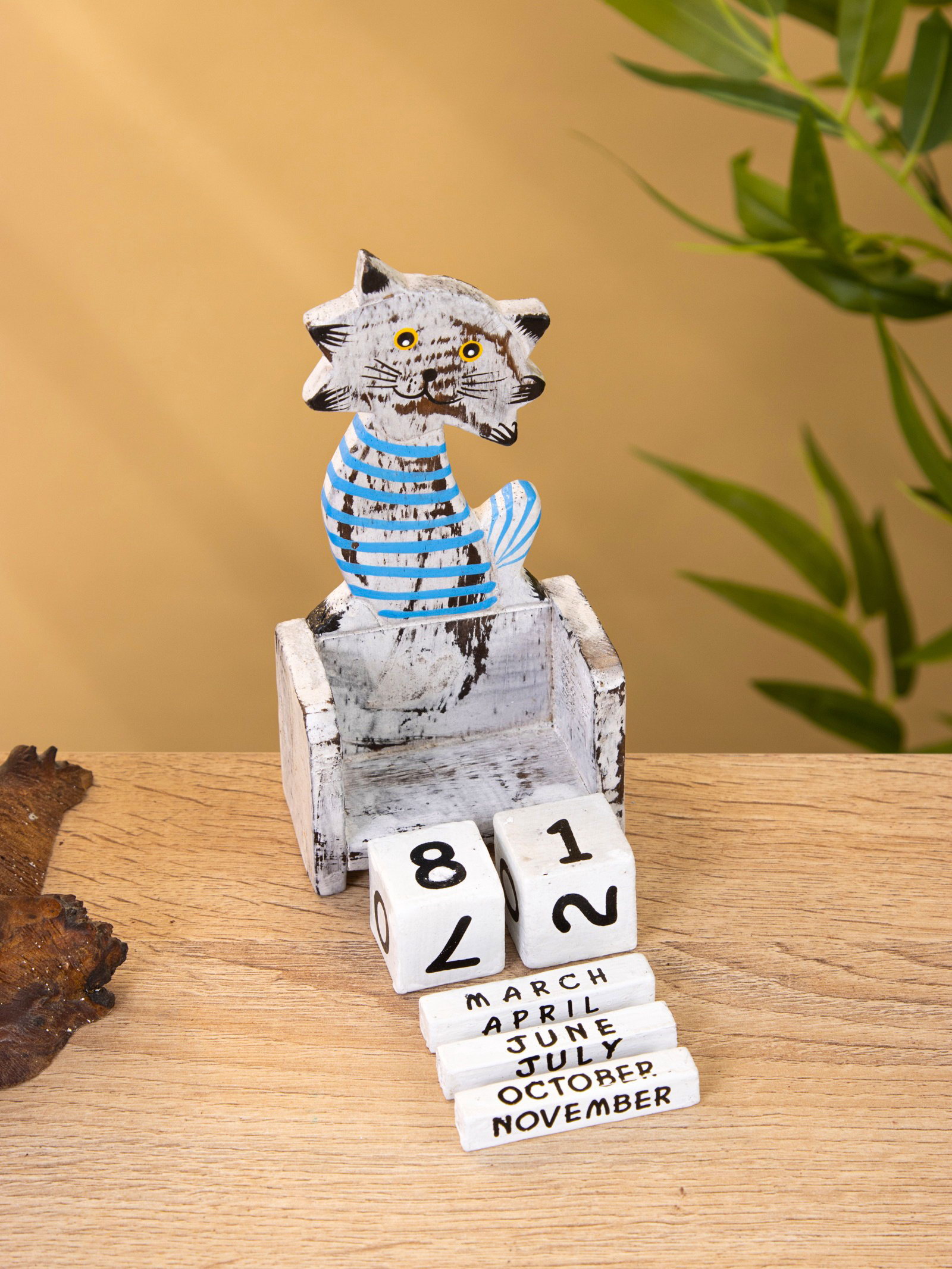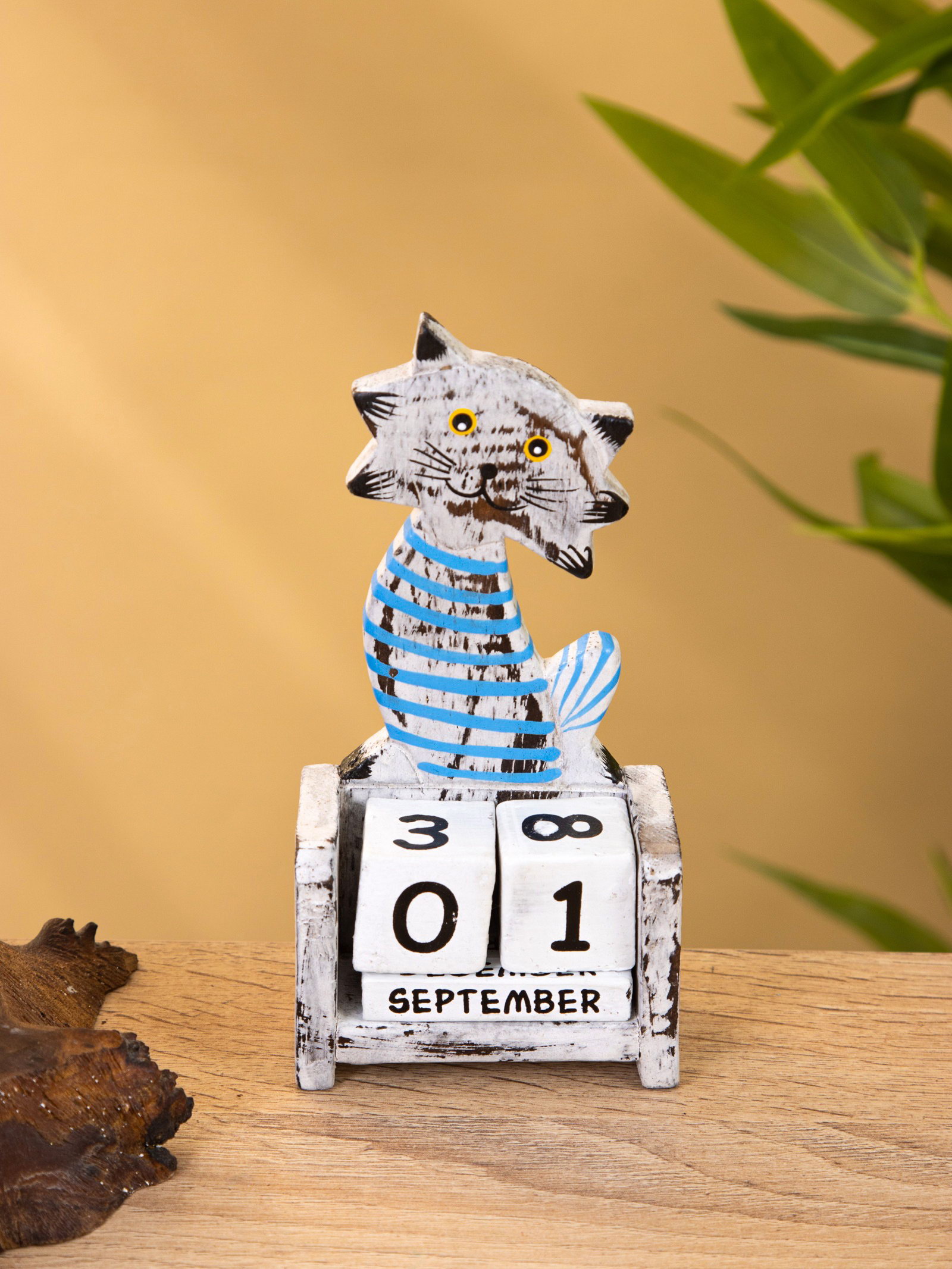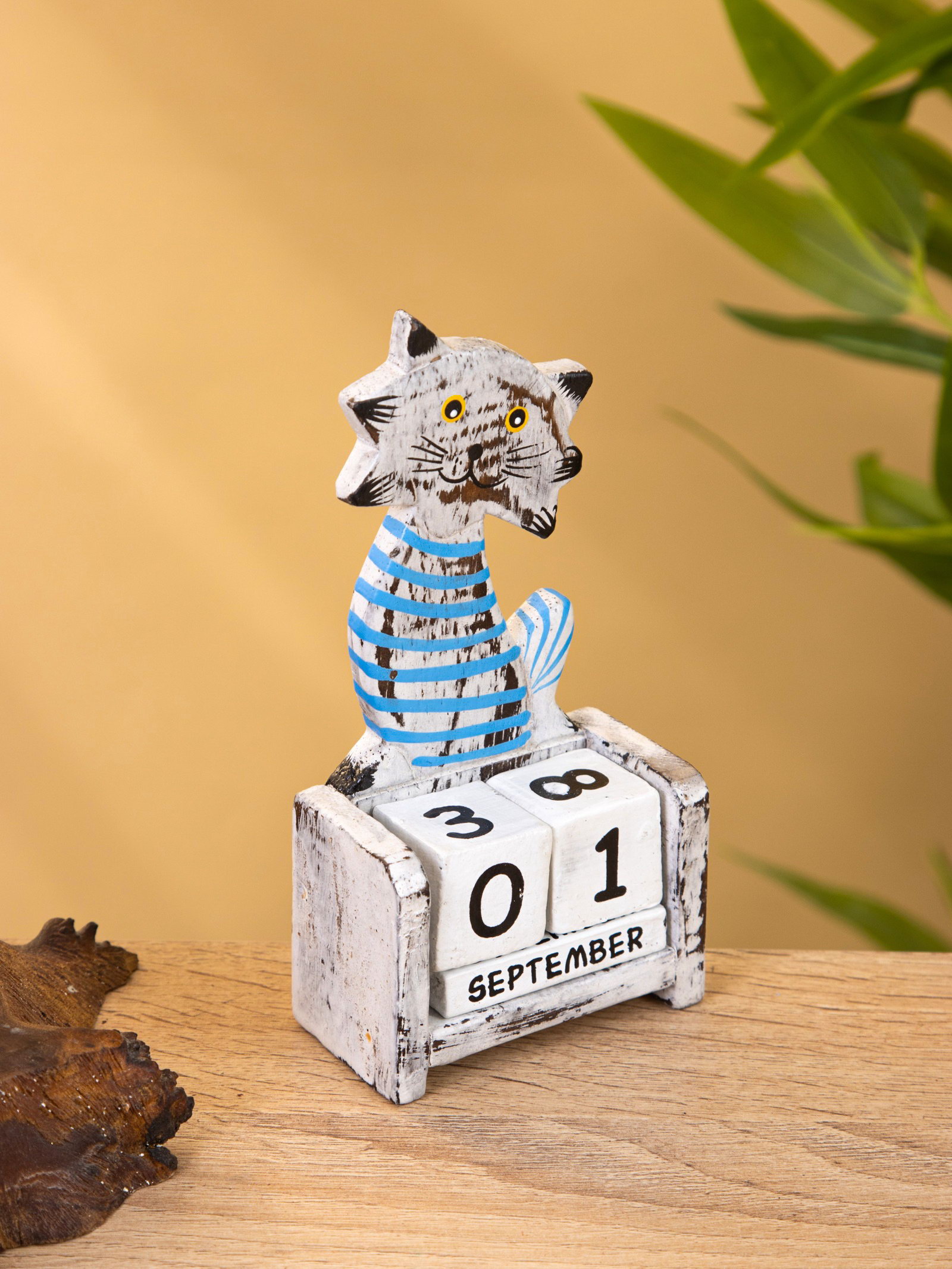 Календарь настольный "Полосатый кот", 7x4x14 см, дерево, серо-голубой, 4x7x14 см., Индонезия