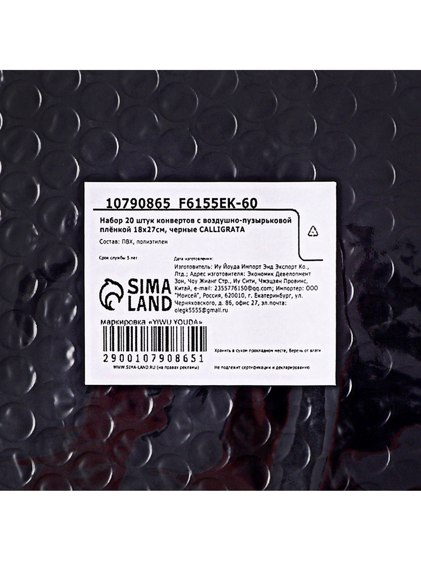 Набор конвертов с воздушно-пузырьковой плёнкой, 20 штук, 18x27 см, черные, 18x27x0.5 см., Calligrata, Китай