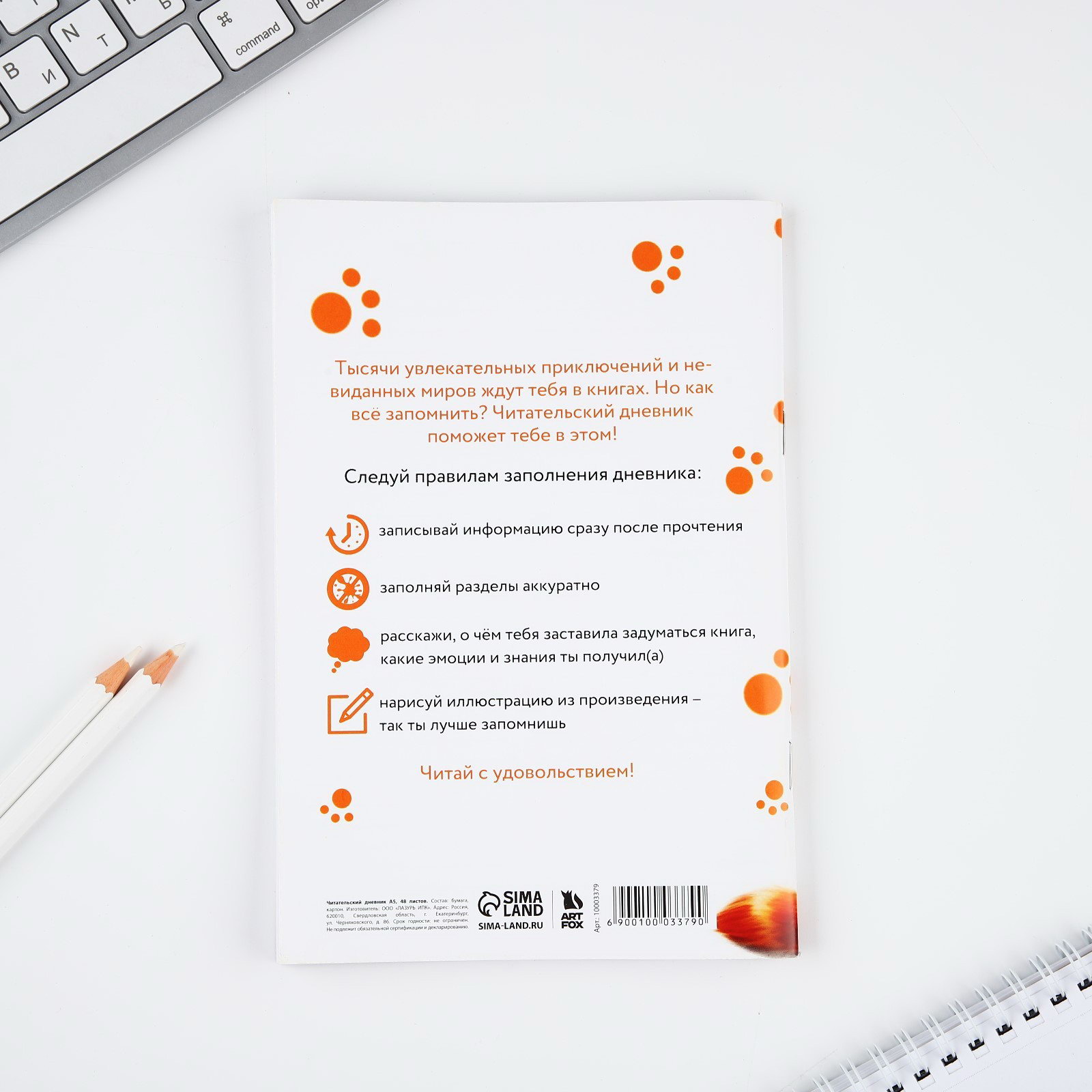 Размер упаковки: 14 x 0.5 x 21 см. Плотность, г/?2: 80 Набор: Нет Рисунок: Да Белизна блока, %: 95-100 Материал обложки: Мелованная бумага Линовка блока: Линейка Формат: А5 Цвет обложки: Белый Тип скрепления: На скобе Отделка: Без отделки Особенности блока: Белая бумага Дизайн обложки: С рисунком Вид обложки: Мягкая tnved: 4820103000 tnved: 4820103000 Количество листов: 48 Тысячи увлекательных приключений и невиданных миров ждут тебя в книгах. Но как всё запомнить? Читательский дневник поможет тебе в этом! Следуй правилам заполнения дневника: • Записывай информацию сразу после прочтения; • Заполняй разделы аккуратно; • Расскажи, о чём тебя заставила задуматься книга, какие эмоции и знания ты получил(а); • Нарисуй иллюстрацию из произведения- так ты лучше запомнишь.