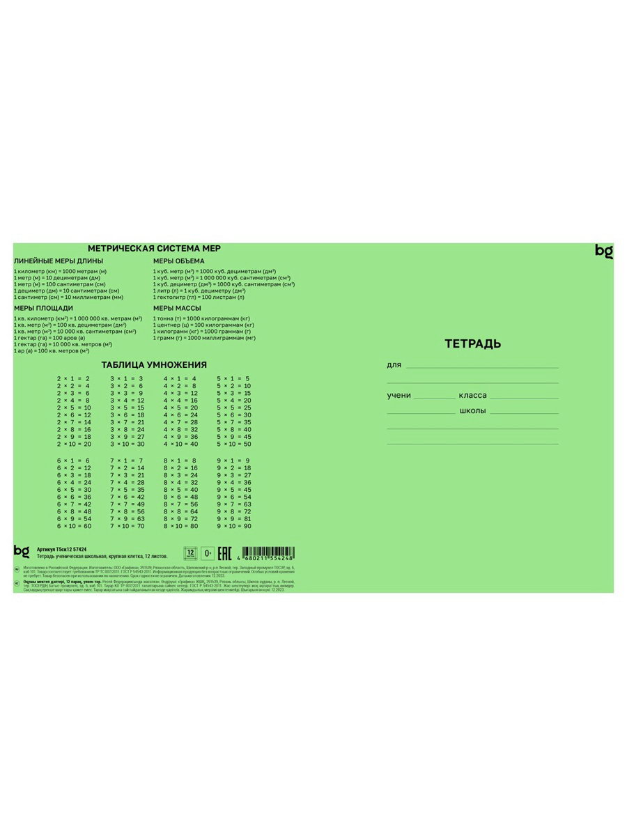 Тетрадь 12 листов в крупную клетку "Зелёная обложка", плотность обложки 65 г/?2, 16.5x20x0.2 см., Маяк, Россия