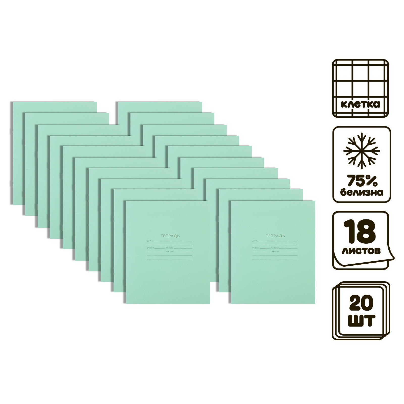 Комплект тетрадей из 20 штук, 18 листов в клетку КПК "Зелёная обложка", блок №2, 60 г/?2, белизна 75%, Calligrata, Россия