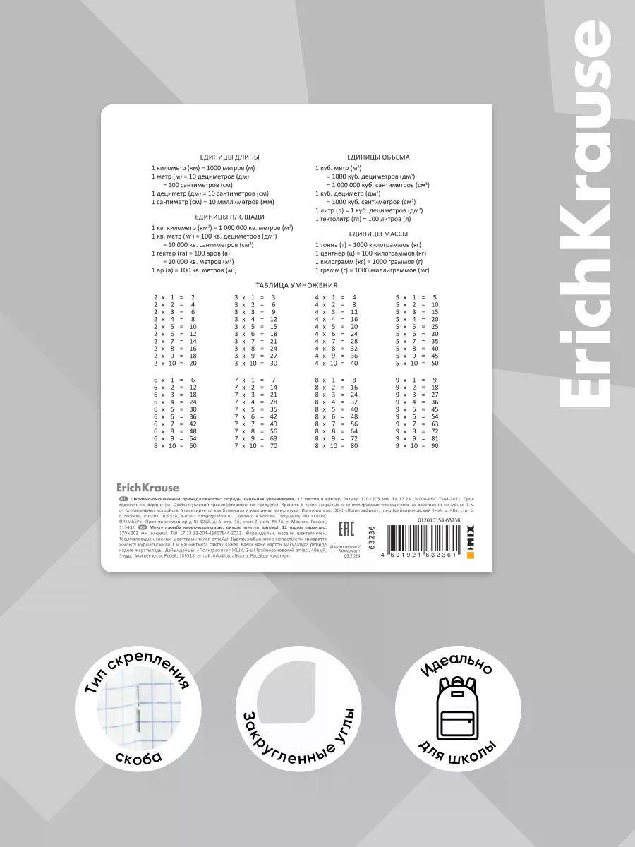 Размер упаковки: 17 x 0.2 x 20.5 см. tnved: 4820200000 Температурное ограничение: Нет Тетрадь школьная ученическая формата А5+ (170х203 мм). Обложка из высококачественного мелованного картона плотностью 170 г/м2. В блоке 12 листов в клетку с полями. Бумага офсетная плотностью 60 г/м2. Цвет линовки - синий. Скругленные уголки обложки и блока. Тип скрепления - скоба. Характеристики: Формат: А5+ Тип скрепления: скоба Количество листов: 12 Линовка: клетка Материал обложки: мелованный картон | ||