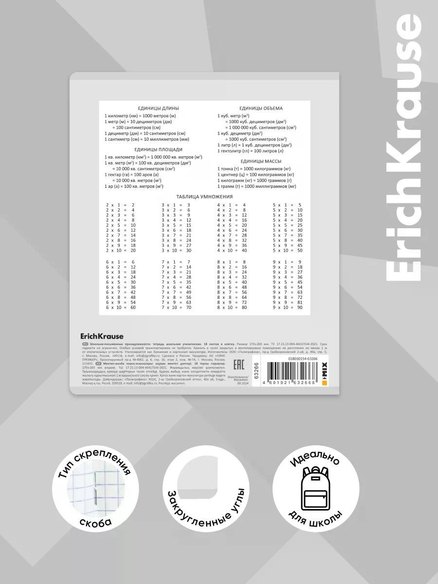 Размер упаковки: 20.5 x 0.2 x 17 см. tnved: 4820200000 Температурное ограничение: Нет Тетрадь школьная ученическая формата А5+ (170х203 мм). Обложка из высококачественного мелованного картона плотностью 170 г/м2. В блоке 18 листов в клетку с полями. Бумага офсетная плотностью 60 г/м2. Цвет линовки - синий. Скругленные уголки обложки и блока. Тип скрепления - скоба. Характеристики: Формат: А5+ Тип скрепления: скоба Количество листов: 18 Линовка: клетка Материал обложки: мелованный картон | ||