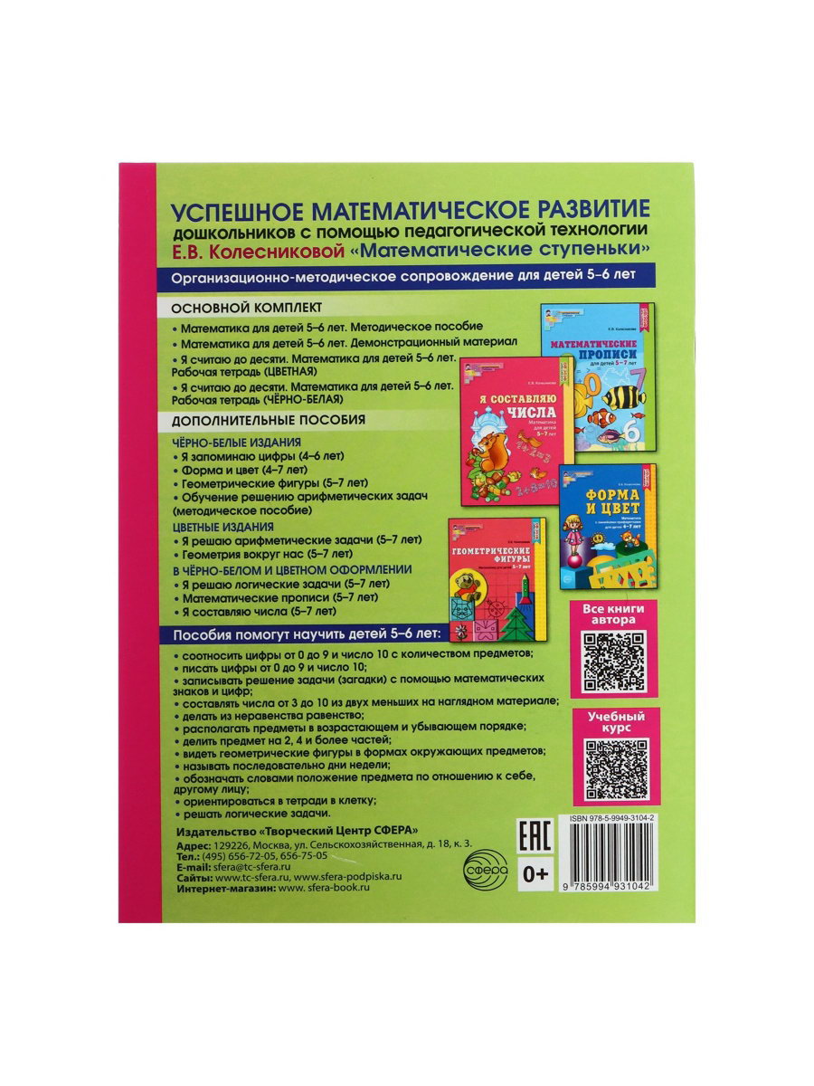 Линовка блока: Без линовки, Клетка Тема обучения: Развитие логики/мышления, Развитие моторики, Цифры, счёт, математика Возраст: Для детей, От 5 лет Размер упаковки: 0.5 x 26 x 20 см. Язык издания: Русский Формат: А5+ tnved: 4901990000 Школьный предмет: Математика Вид: Рабочие тетради Количество страниц: 64 Тематика: Подготовка к школе Тип обложки: Мягкий переплёт Год издания: 2023 Набор: Нет Автор: Колесникова Елена Владимировна Полноцветная рабочая тетрадь для детей 5–6 лет поможет подготовиться к школе и освоить основы математики. Игровая форма занятий делает обучение увлекательным, а яркие иллюстрации удерживают внимание ребёнка. Подходит для самостоятельных занятий с родителями и для работы в детском саду. Что внутри?