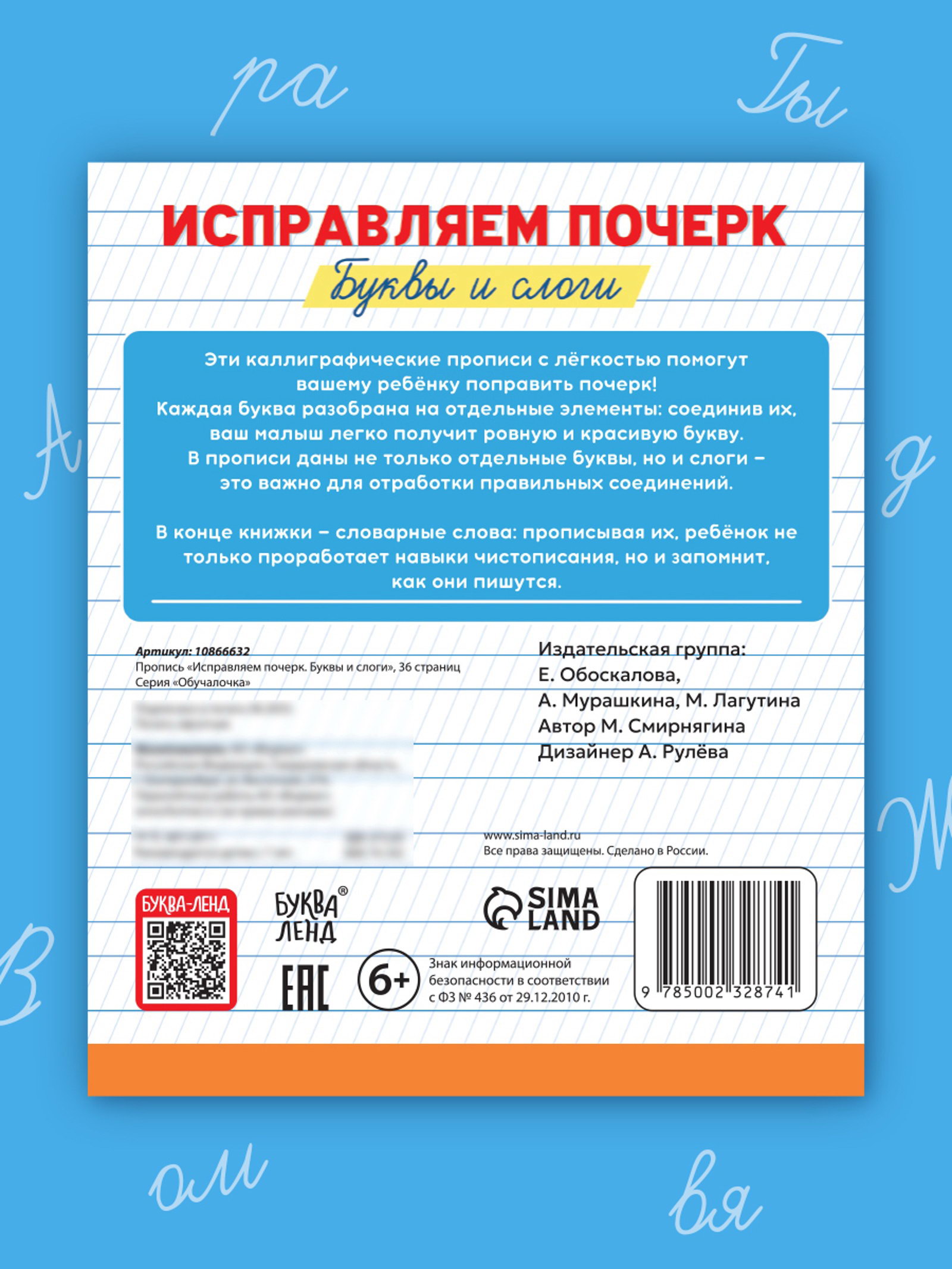 Линовка блока: Без линовки, Косая линейка, Узкая линейка Тема обучения: Буквы, слова, русский язык, Развитие моторики Размер упаковки: 17 x 0.5 x 20.5 см. tnved: 4903000000 Набор: Нет Тип обложки: Мягкий переплёт Год издания: 2025 Автор: Смирнягина Мария Олеговна Возраст: От 6 лет Язык издания: Русский Количество страниц: 36 Формат: А5+ Вид: Прописи Прописи "Исправляем почерк. Буквы и слоги" это эффективный инструмент для улучшения навыков письма у детей 6-8 лет. Автор Мария Смирнягина создала пособие, которое помогает ребёнку освоить правильное написание букв и слогов, развивая мелкую моторику и мышечную память. Особенности