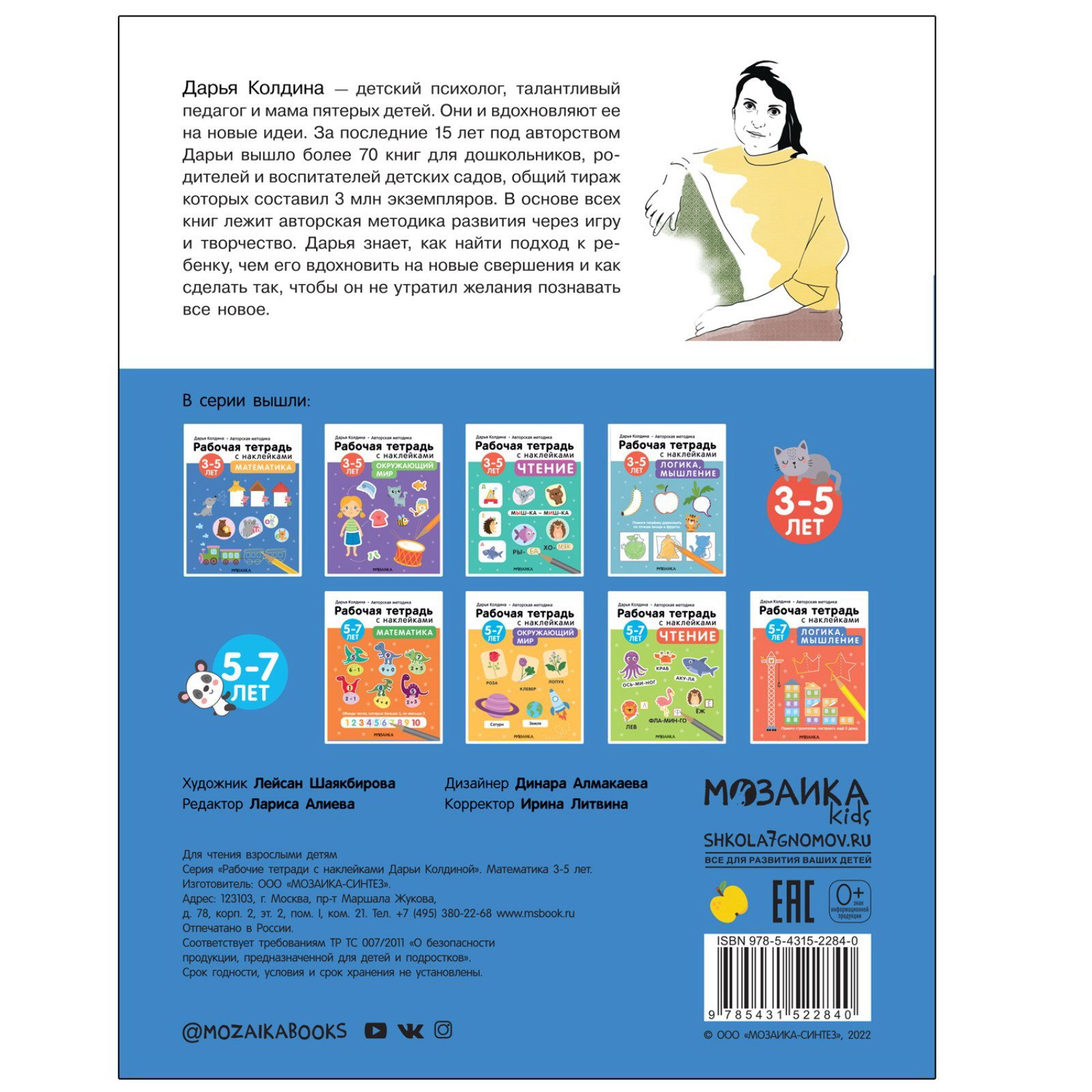 Возраст: Для детей, От 3 лет Тематика: Подготовка к школе, Развивающие пособия 3-5 лет Размер упаковки: 19.5 x 0.2 x 25.5 см. tnved: 4901100000 Линовка блока: Без линовки Язык издания: Русский Формат: А5+ Год издания: 2022 Тип обложки: Мягкий переплёт Количество страниц: 24 Автор: Колдина Дарья Николаевна Вид: Рабочие тетради Набор: Нет Математика 3-5 лет (Рабочие тетради с наклейками. Авторская методика Дарьи Колдиной). Рабочая тетрадь "Математика 3-5 лет" из серии "Рабочие тетради с наклейками. Авторская методика Дарьи Колдиной" предназначена для развития математических представлений и обучения счёту детей от 3 до 5 лет. Книга разработана педагогом и психологом Дарьей Колдиной на основе её авторской методики развития через игру и творчество. Материал в рабочей тетради подается по мере усложнения в игровой форме: много разных, непохожих друг на друга, заданий, большое количество наклеек и иллюстрации, вызывающие эмоциональный отклик у ребёнка. А в помощь взрослому в каждой книге есть советы и рекомендации от автора методики. | ||