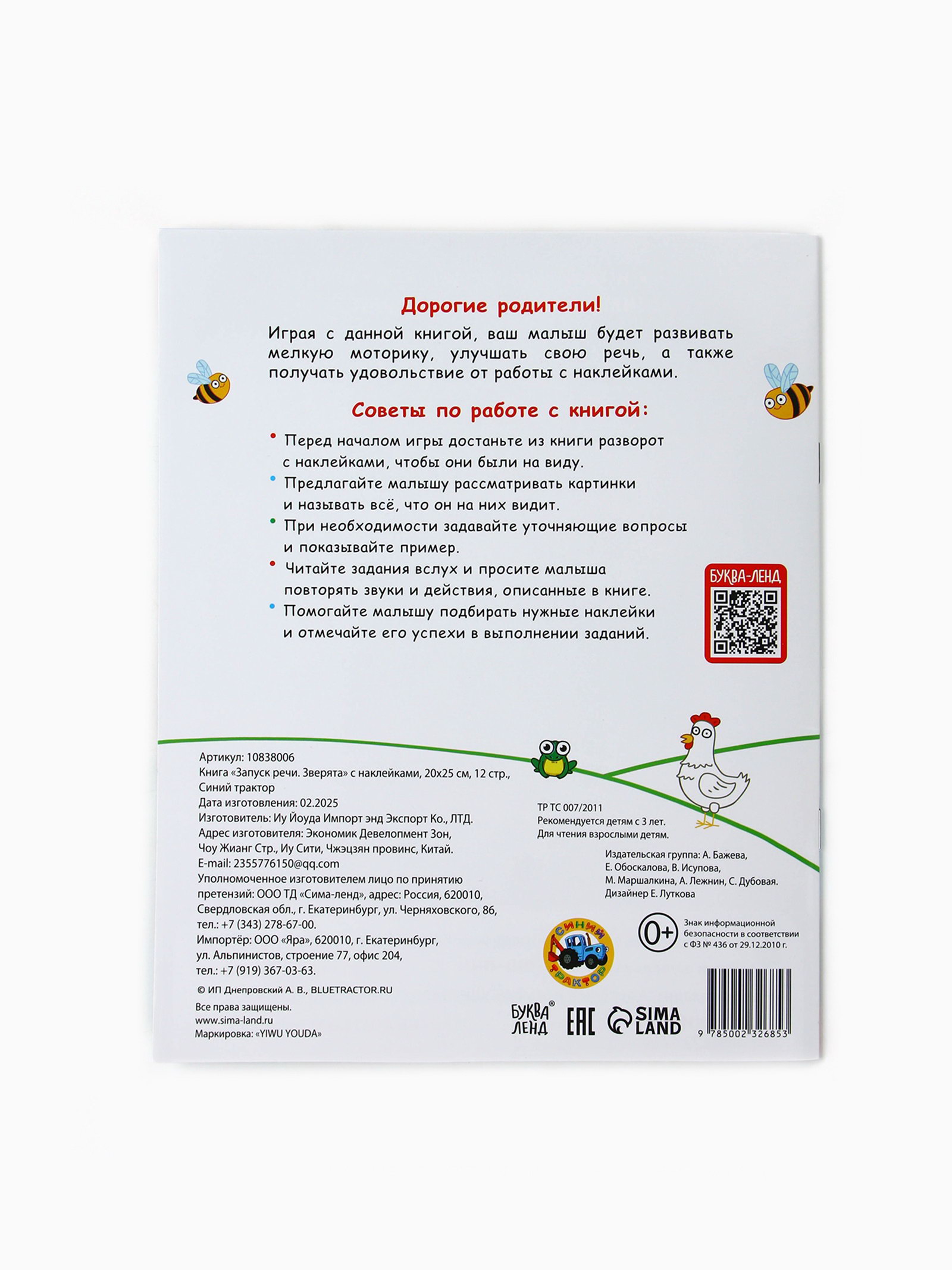 Книга "Запуск речи. Зверята" с наклейками, 20x25 см, 12 стр., 25x20x0.3 см., Синий трактор, Китай