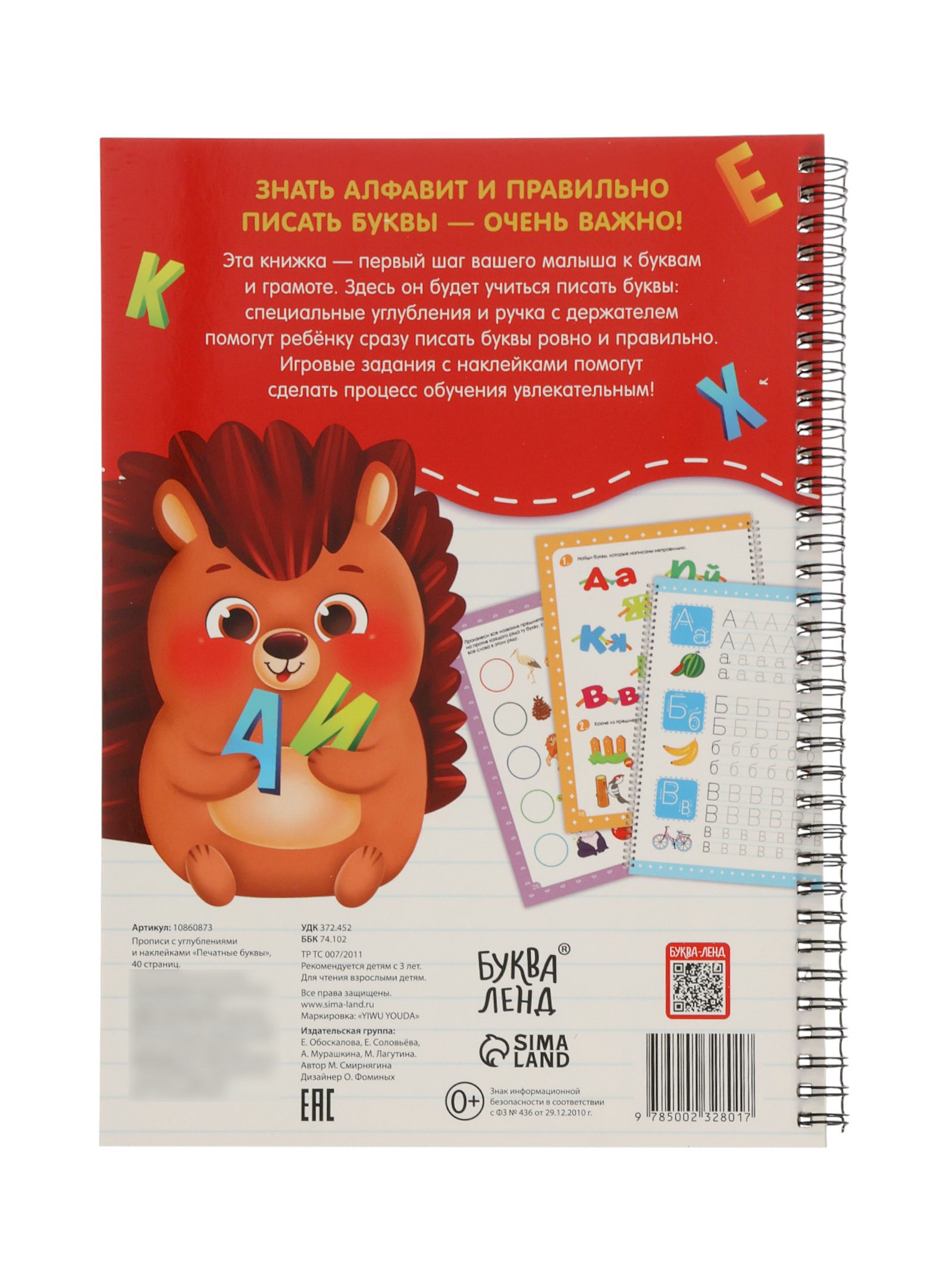 Размер упаковки: 23 x 1.5 x 30 см. tnved: 4903000000 Тип обложки: Мягкий переплёт Автор: Смирнягина Мария Олеговна Язык издания: Русский Линовка блока: Без линовки Набор: Нет Количество страниц: 40 Год издания: 2025 Вид: Прописи Возраст: От 3 лет Формат: А4 А чтобы учиться было веселее, в комплекте яркие наклейки с буквами и словами. Их можно использовать для закрепления, игр или создания собственных мини-книжек. Так письмо перестаёт быть обязанностью и становится частью увлекательного процесса: "Я сам написал "А" и вот она, моя наклейка!" Почему эти прописи работают даже с самыми неусидчивыми: