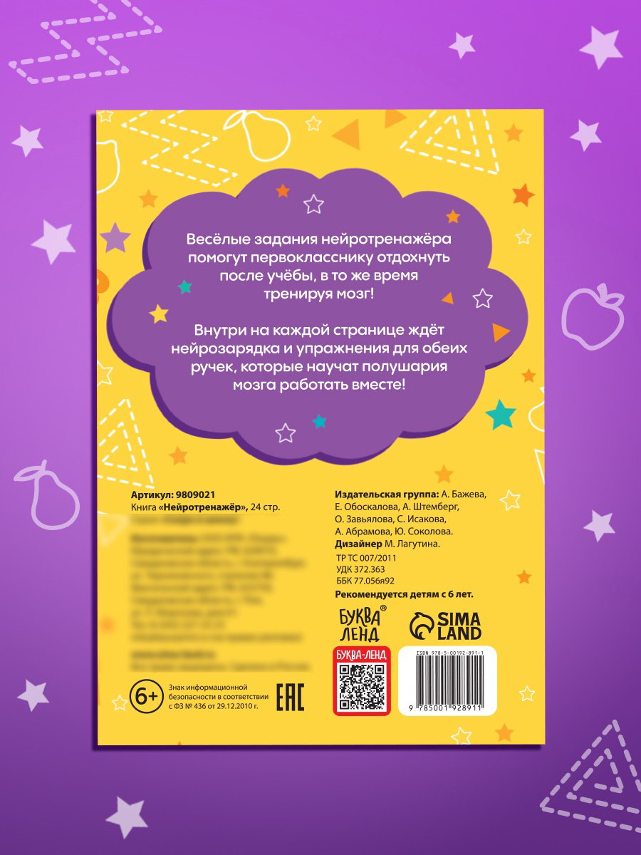 Тема обучения: Развитие логики/мышления, Развитие моторики Размер упаковки: 0.2 x 24 x 17 см. Температурное ограничение: Нет Язык издания: Русский Возраст: От 6 лет Набор: Нет Формат: А5+ Год издания: 2023 Автор: Коллектив авторов Количество страниц: 24 Вид: Обучающие книги Тип обложки: Мягкий переплёт tnved: 4903000000 Линовка блока: Без линовки Книга "Нейротренажёр" станет увлекательным занятием для детей от 6 лет. Эти 24 страницы с весёлыми заданиями помогут ребёнку не только отдохнуть после учёбы, но и потренировать мышление, развивая оба полушария мозга. Особенности