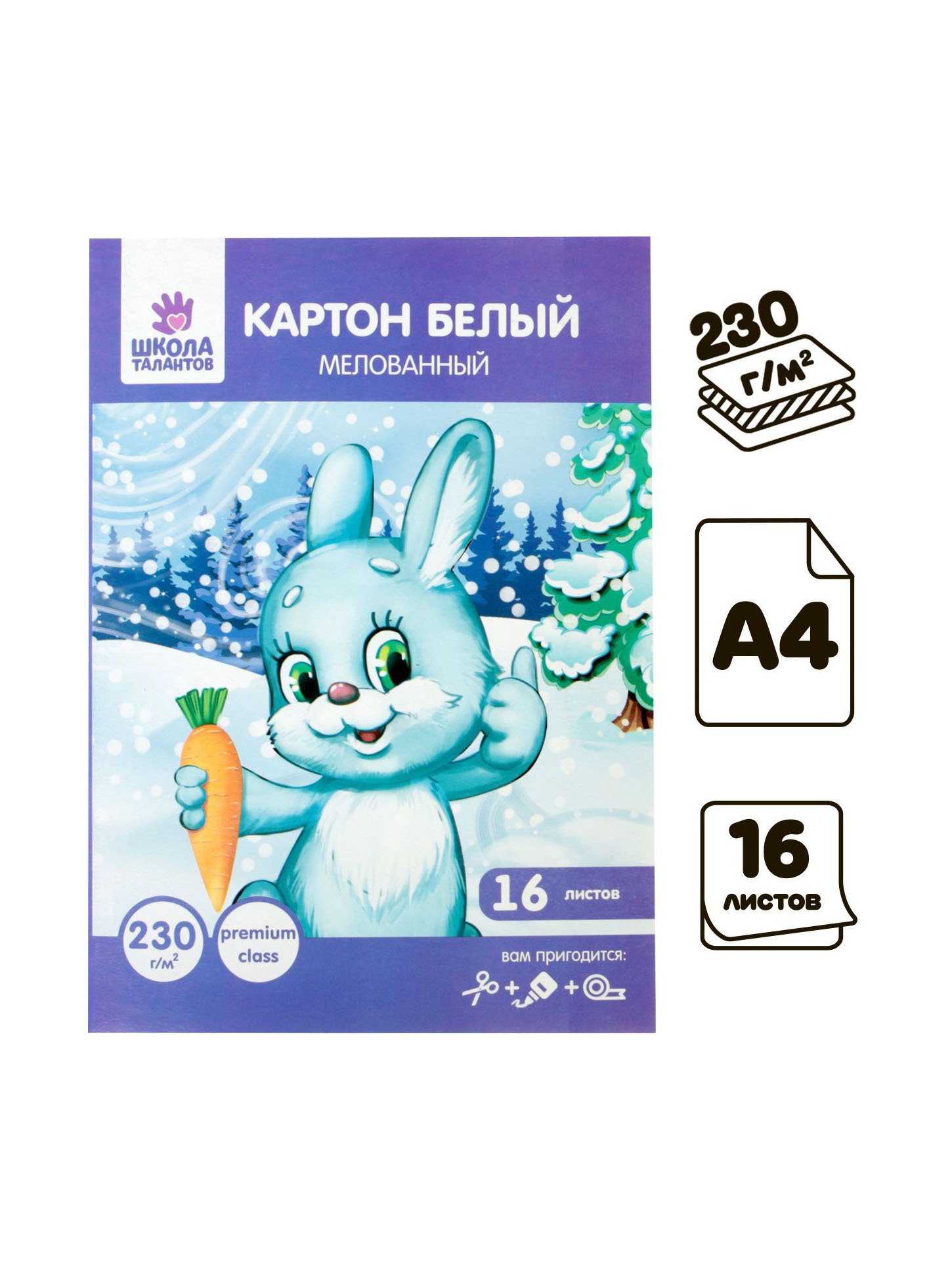 Картон белый мелованный А4, 16 листов, 230 г/?2, Школа талантов, Россия