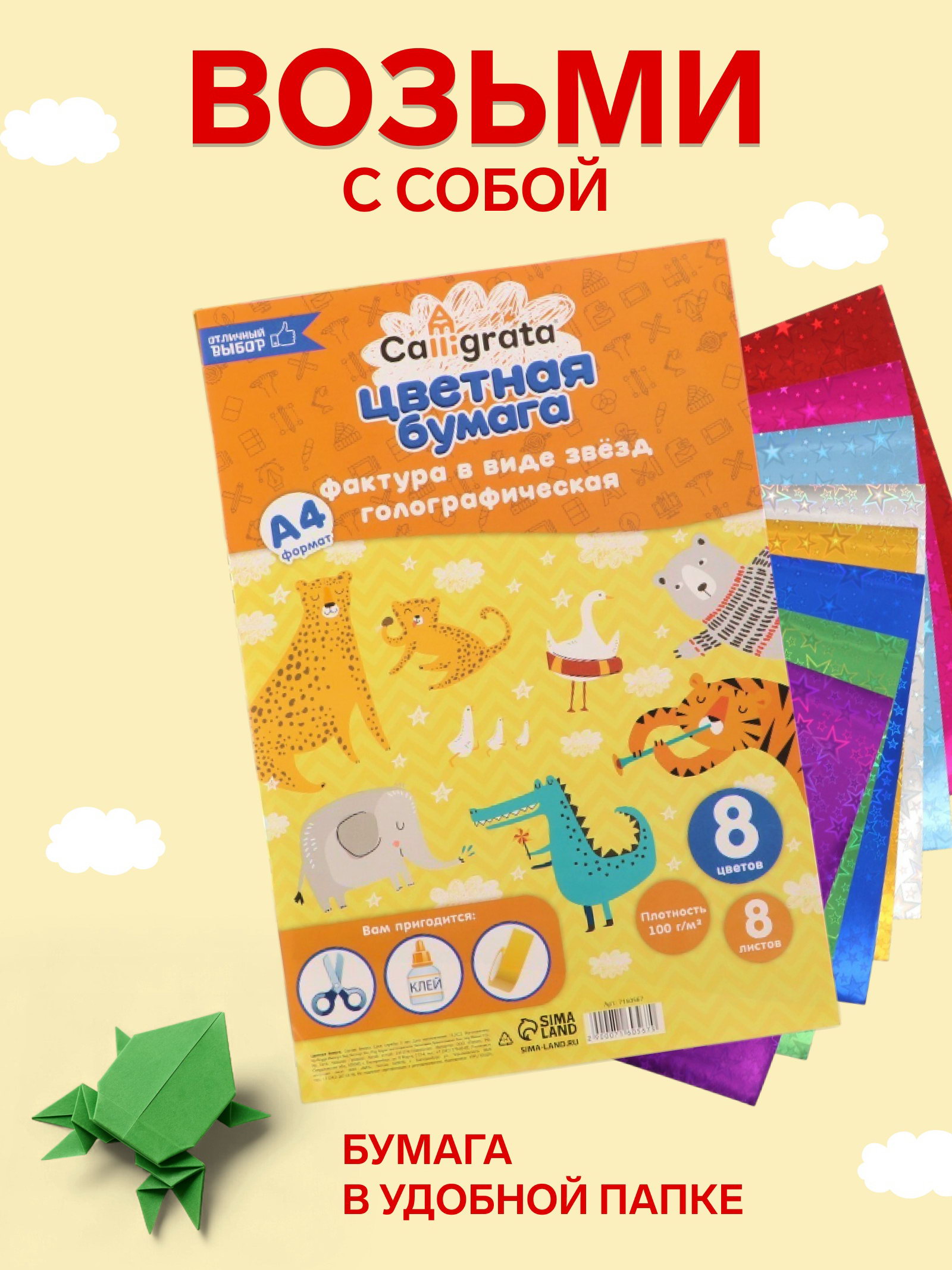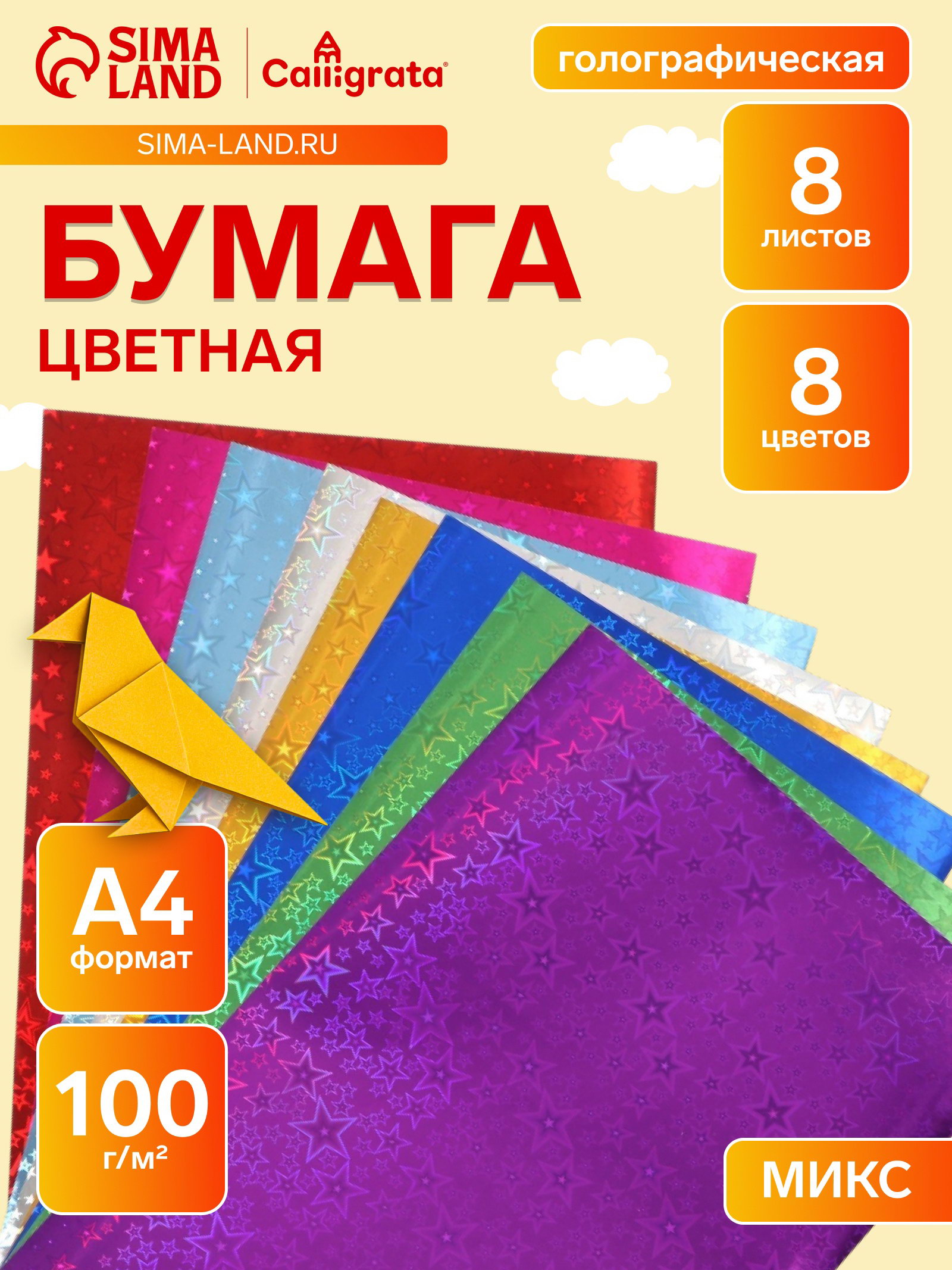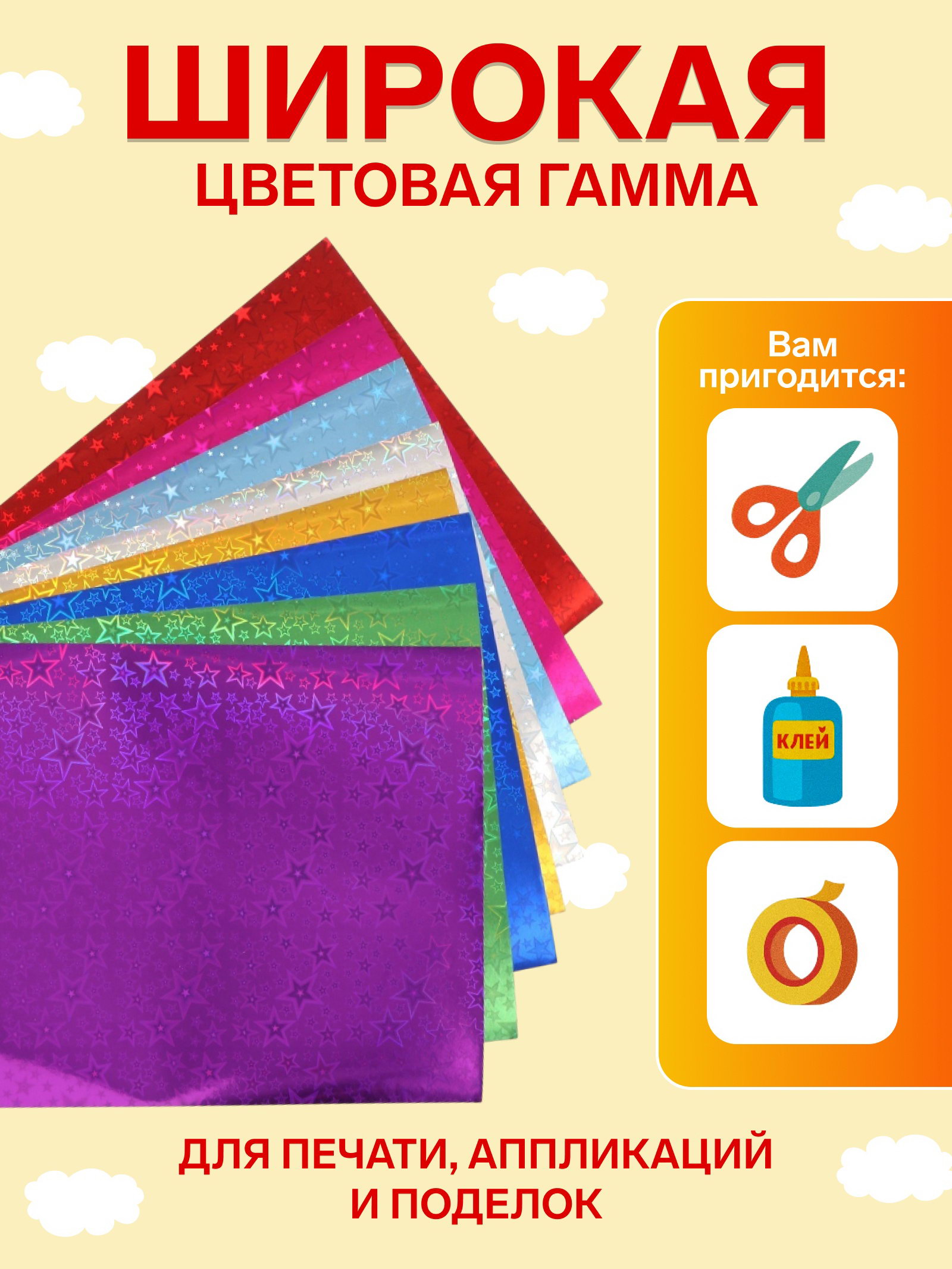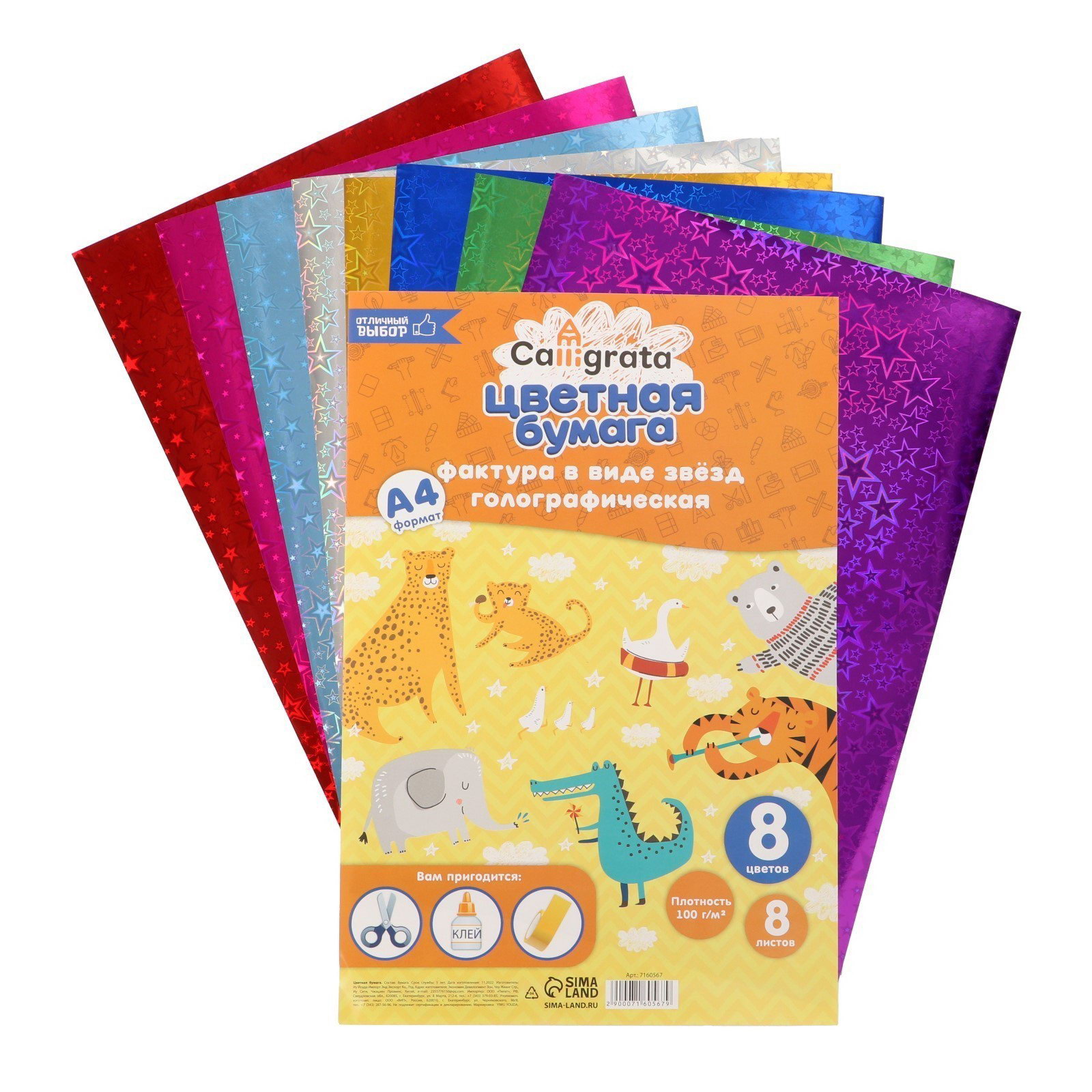 Набор бумаги голографической "Звезды" А4, 8 листов, 8 цветов, рисунок, 100 г/?2, 19.4x0.1x28.5 см., Calligrata, Китай