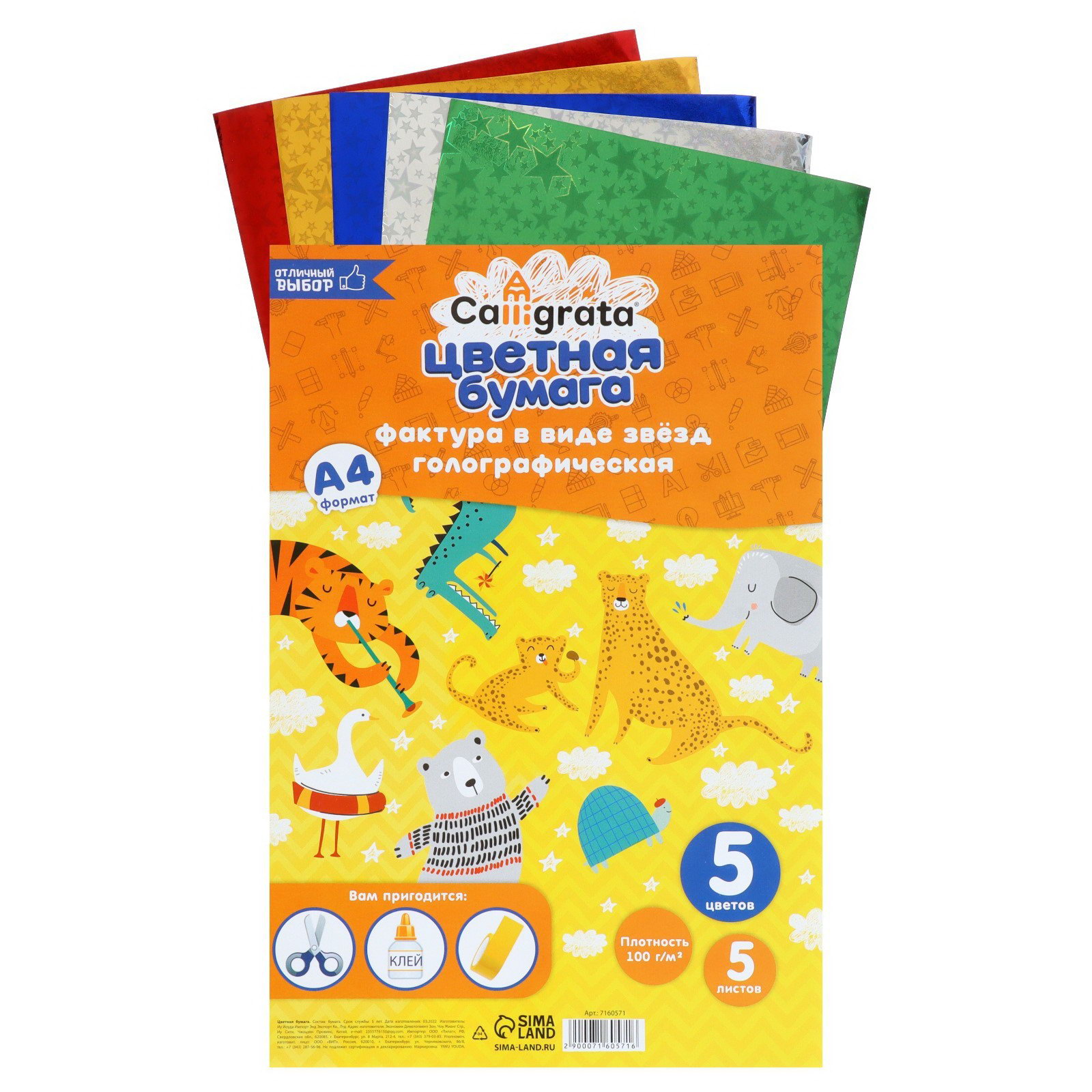 Набор бумаги голографической "Звезды" А4, 5 листов, 5 цветов, рисунок, 100 г/?2, 19.4x0.1x28.5 см., Calligrata, Китай