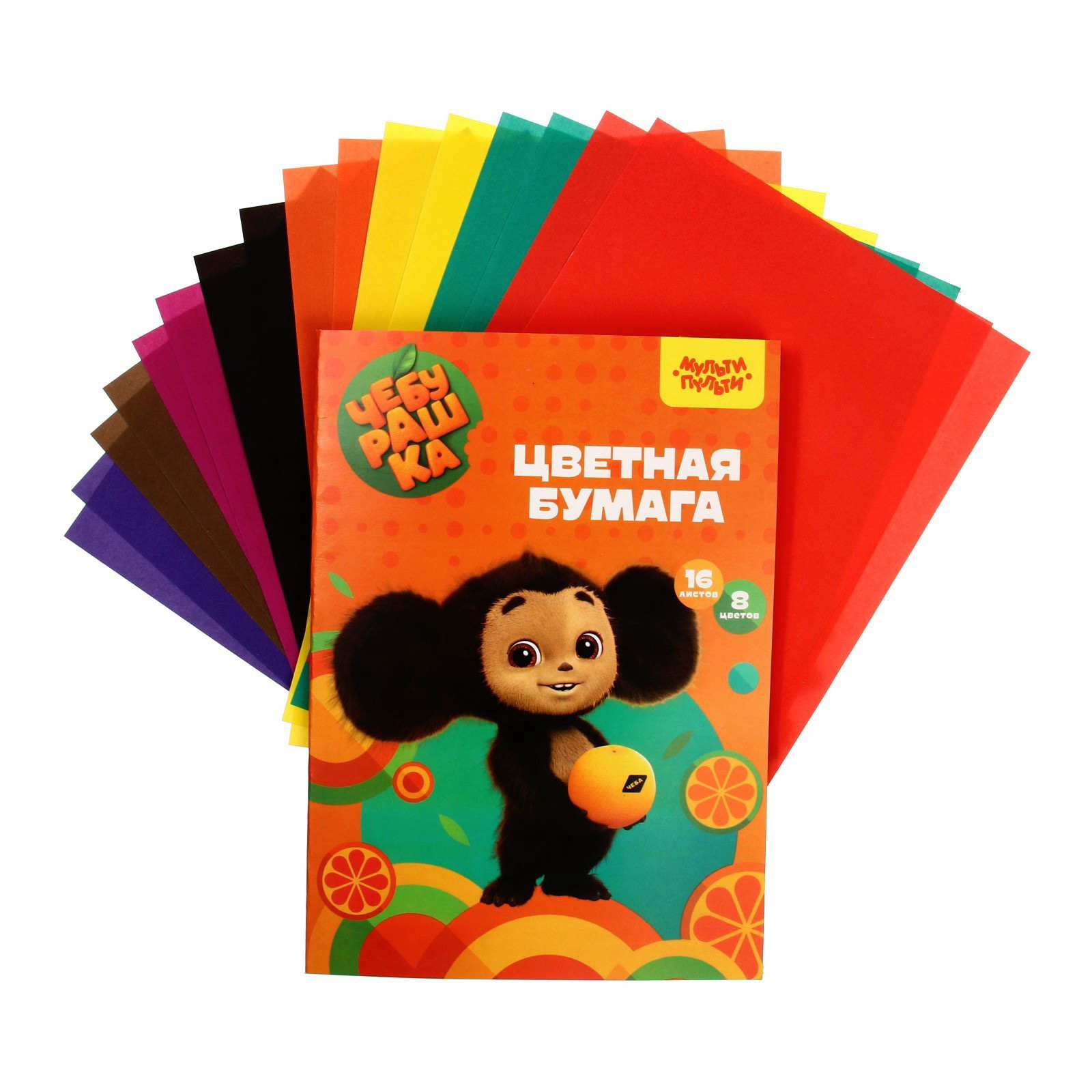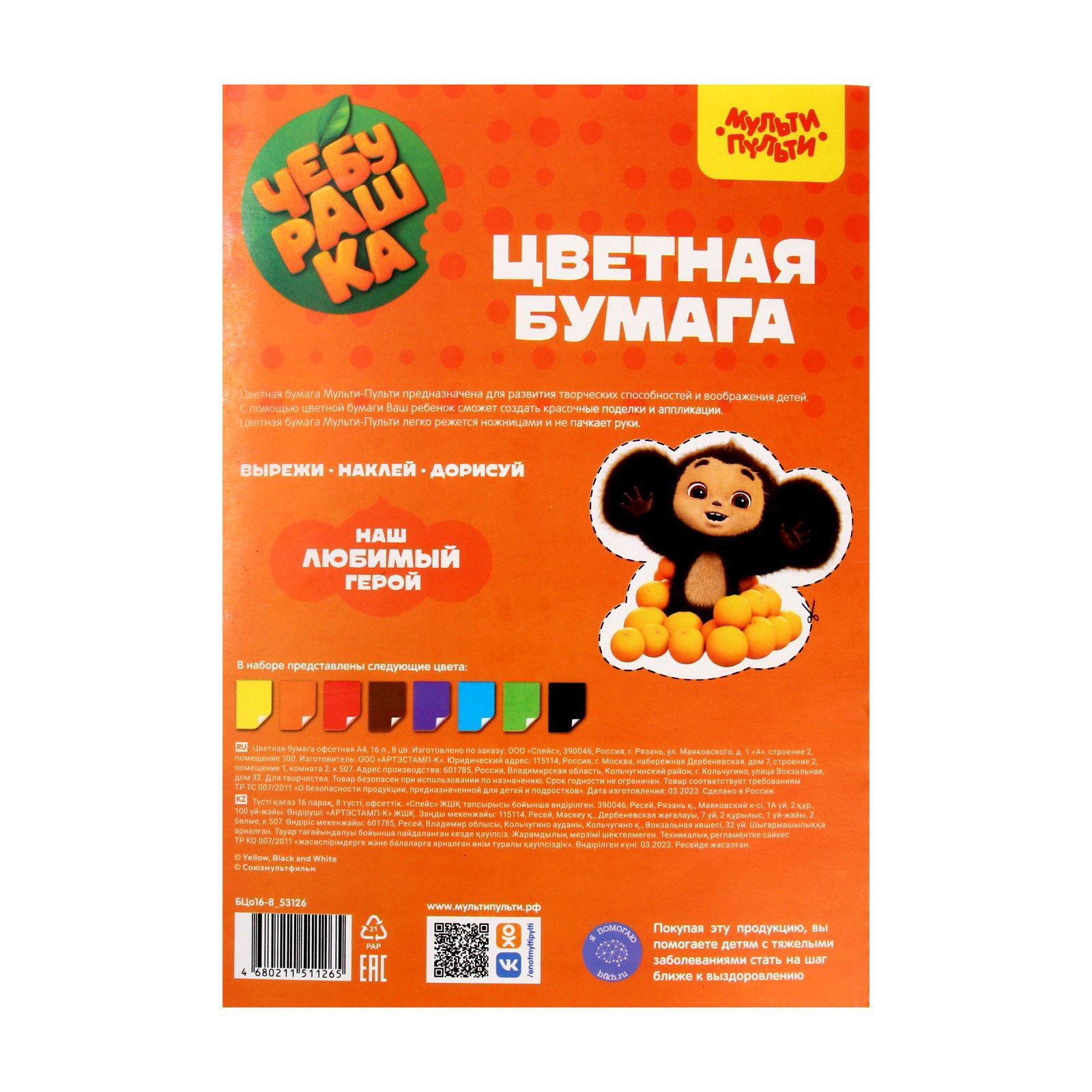 Бумага цветная офсетная А4, 16 листов, 8 цветов "Мульти-Пульти. Чебурашка", в папке, плотность 65 г/?2, ЧЕБУРАШКА, Россия