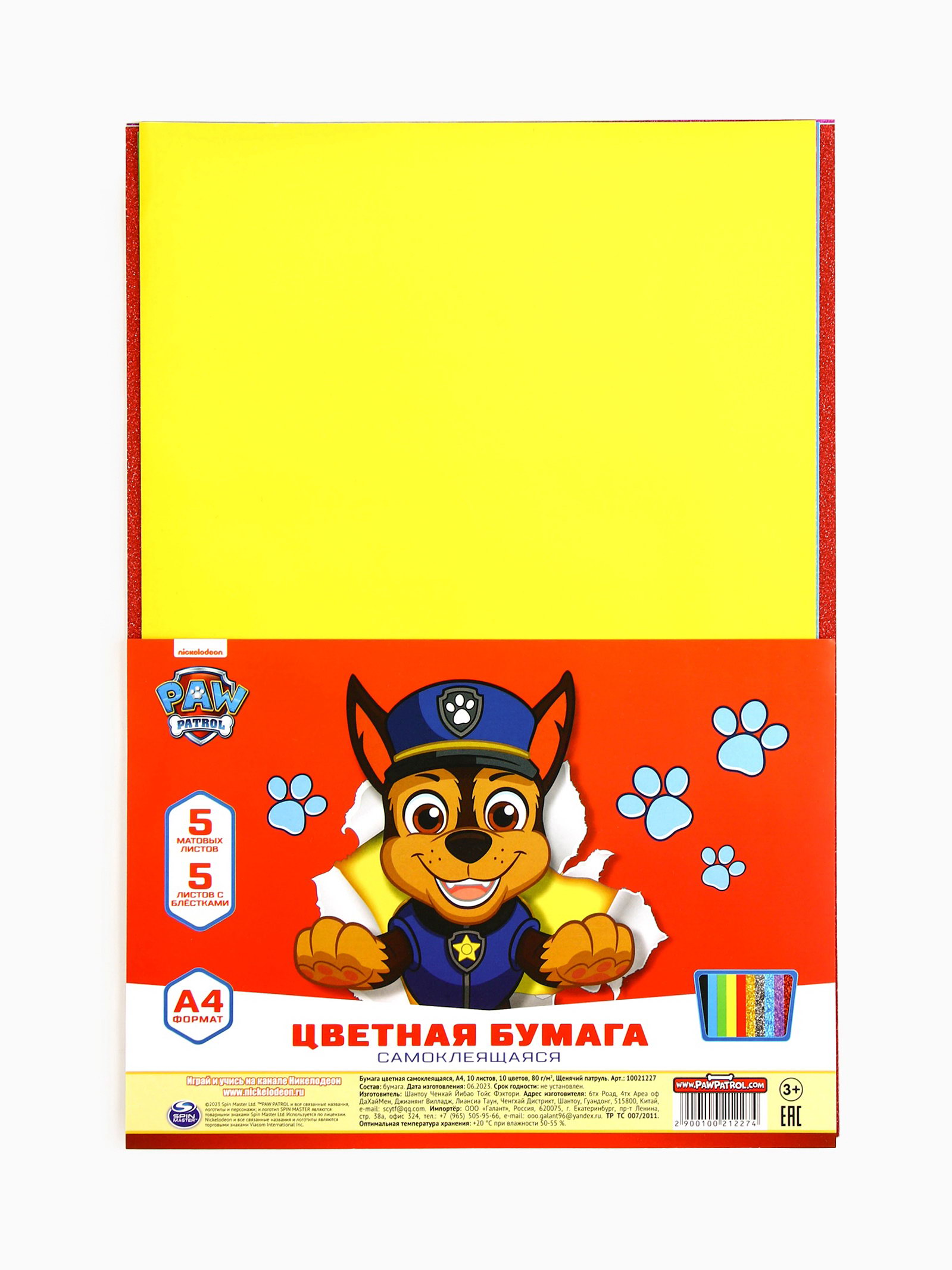 Бумага цветная самоклеящаяся, с блёстками, А4, 10 листов, 10 цветов, мелованная, односторонняя, в пакете, 80 г/?2, Щенячий патруль, 20x30x0.2 см., Paw Patrol, Китай