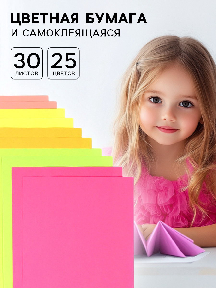 Цветная бумага А4, самоклеящаяся А5, набор 30 листов, 25 цветов, 80 г/?2, ArtFox STUDY, Китай