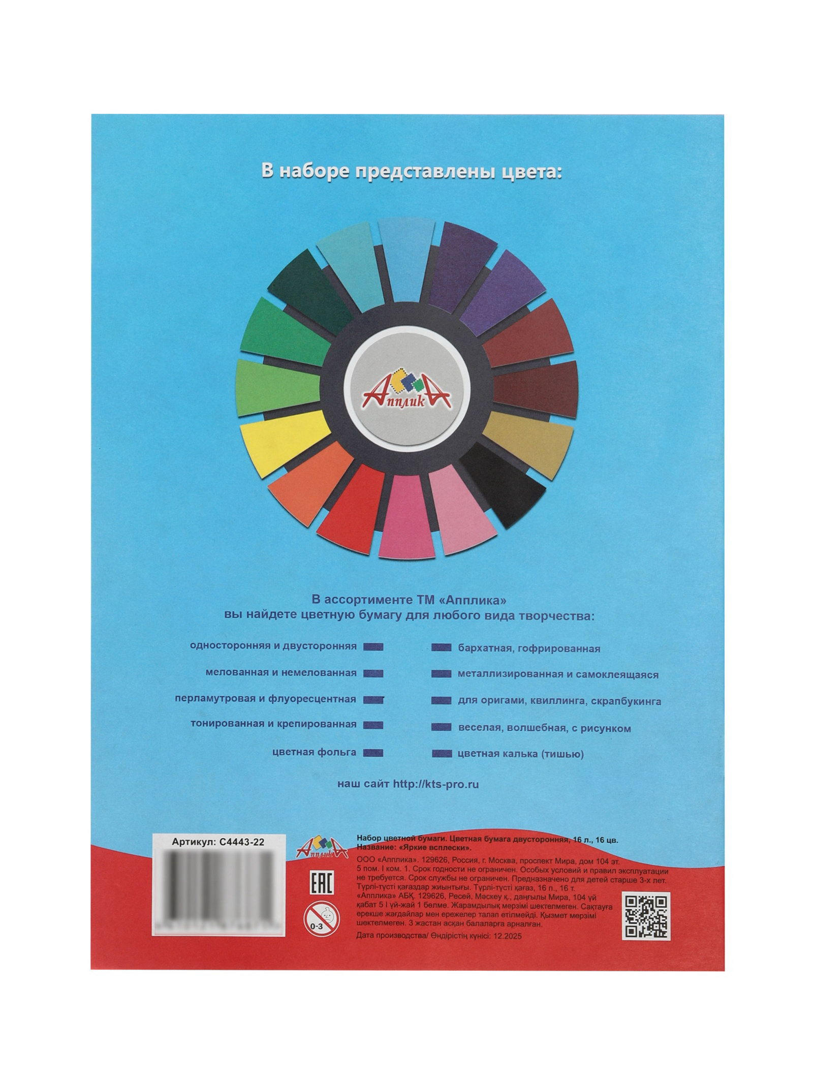 Бумага цветная А4 "Яркие всплески", 16 листов, 16 цветов, газ 50 г/?2, односторонняя, Апплика, Россия