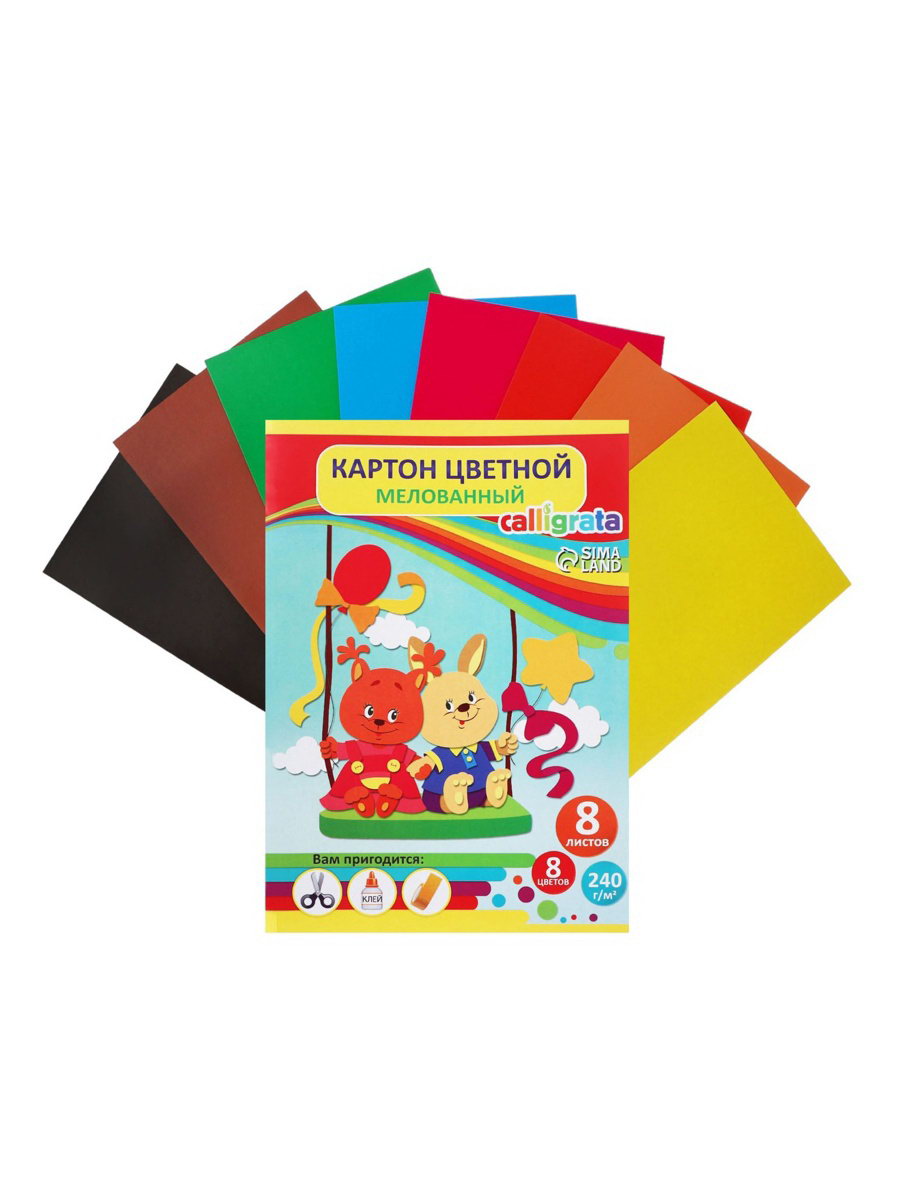 Картон цветной А4, 8 листов, 8 цветов, мелованный, 240 г/?2, в папке, МИКС, Calligrata, Россия