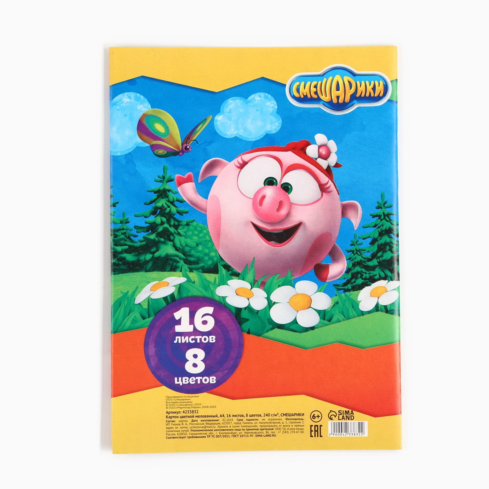 Цветной картон, А4, 16 листов, 8 цветов, мелованный, односторонний, в папке, 220 г/?2, Смешарики, Россия
