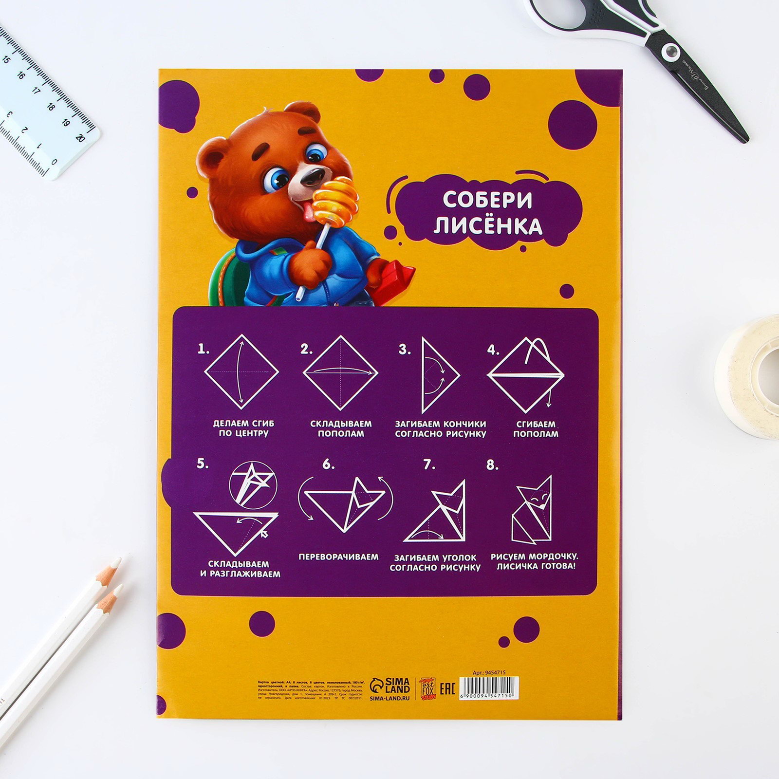Размер упаковки: 20.5 x 28.5 x 0.2 см. Материал обложки: Картон Тип скрепления: В папке Вид обложки: Мягкая Тип: Картон Цвет: Жёлтый Тип листа: Односторонний tnved: 4802559000 Набор: Да Формат: А4 Особенность: Немелованный(ая) Количество листов: 8 Количество цветов: 8 Плотность, г/?2: 180 Цветной картон из серии "Персонажи", торговой марки ArtFox STUDY, идеально подойдет для квиллинга, аппликации и изготовления поделок. Картон имеет приятную на ощупь поверхность, листы плотные, что позволяет использовать их для детского творчества.