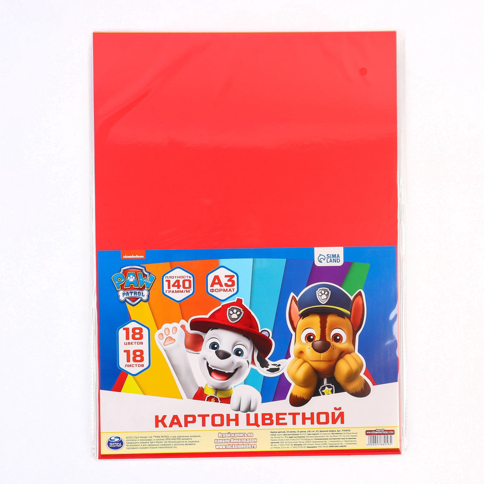 Цветной картон тонированный, А3, 18 листов, 18 цветов, немелованный, двусторонний, в пакете, 140 г/?2, "Щенячий патруль", 38.9x54.6x2.3 см., Paw Patrol, Китай