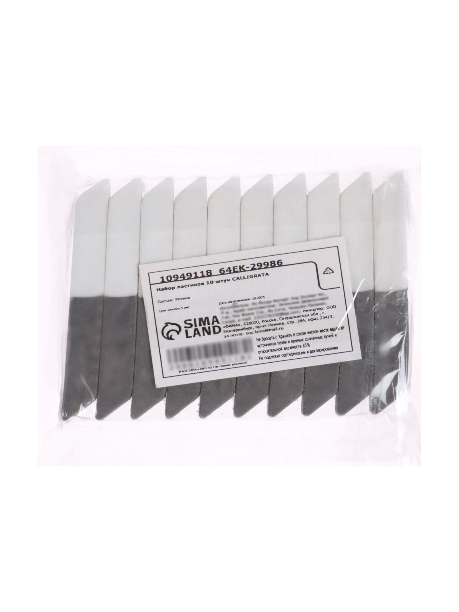 Набор ластиков 10 штук, комбинированные, скошенные, 60x15x6 мм, бело-серые, Calligrata, Китай