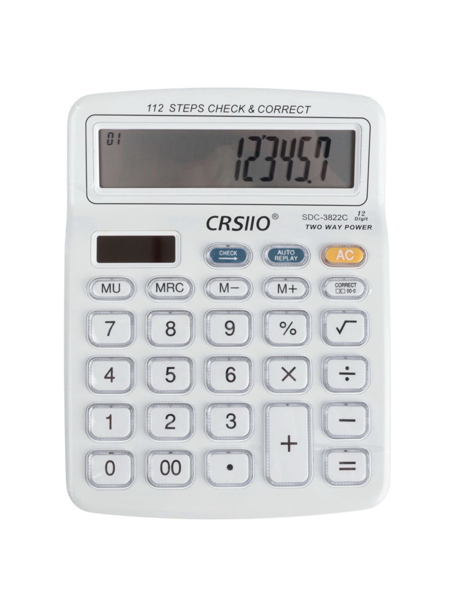 Функции: Квадратный корень, Коррекция вычислений (CHECK, CORRECT) Размер упаковки: 17.5 x 3 x 13 см. Вид калькулятора: Настольный Разрядность дисплея: 8 Поворотный дисплей: Нет Металлический корпус: Нет tnved: 8470100000 Вид батареек: Мизинчиковые ААА Штрихкод на единице товара: Да Вид питания: Двойное Европодвес: Нет Цвет: Белый Простота и функциональность для ежедневных расчётов! Настольный калькулятор SDC-3822C это 12-разрядное вычислительное устройство в белом корпусе. Модель сочетает необходимые функции с удобством использования в офисе или дома.