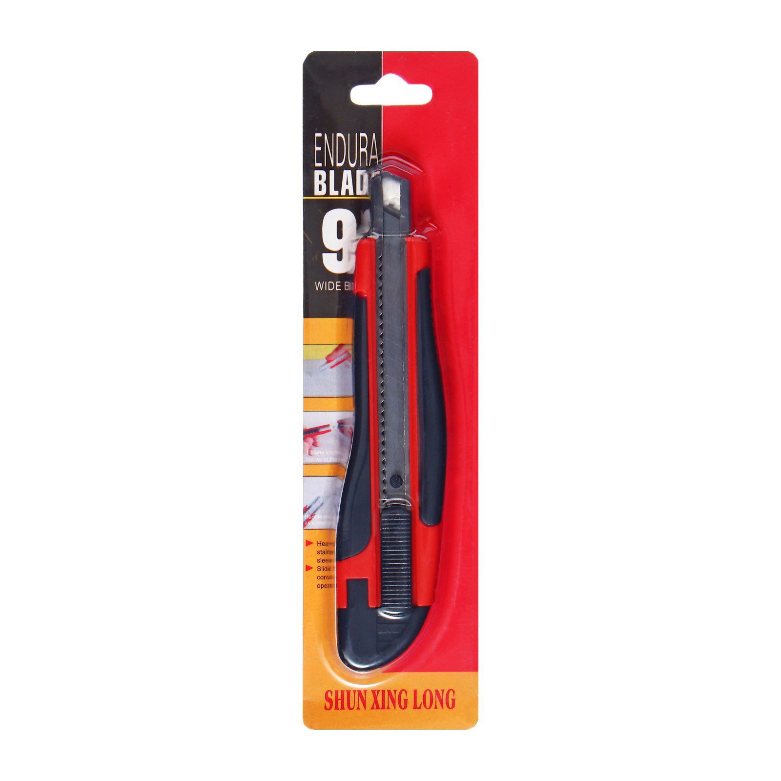 Нож канцелярский, лезвие 9 мм, корпус пластик, с резиновым держателем, с металл., направляющей, фиксатор, 4x1.4x13.5 см., КИТАЙ