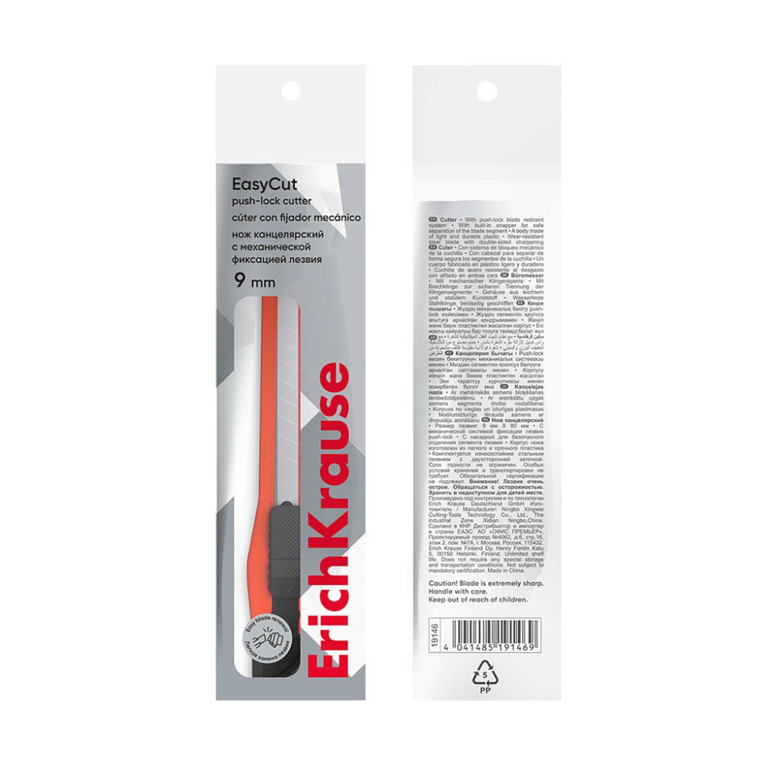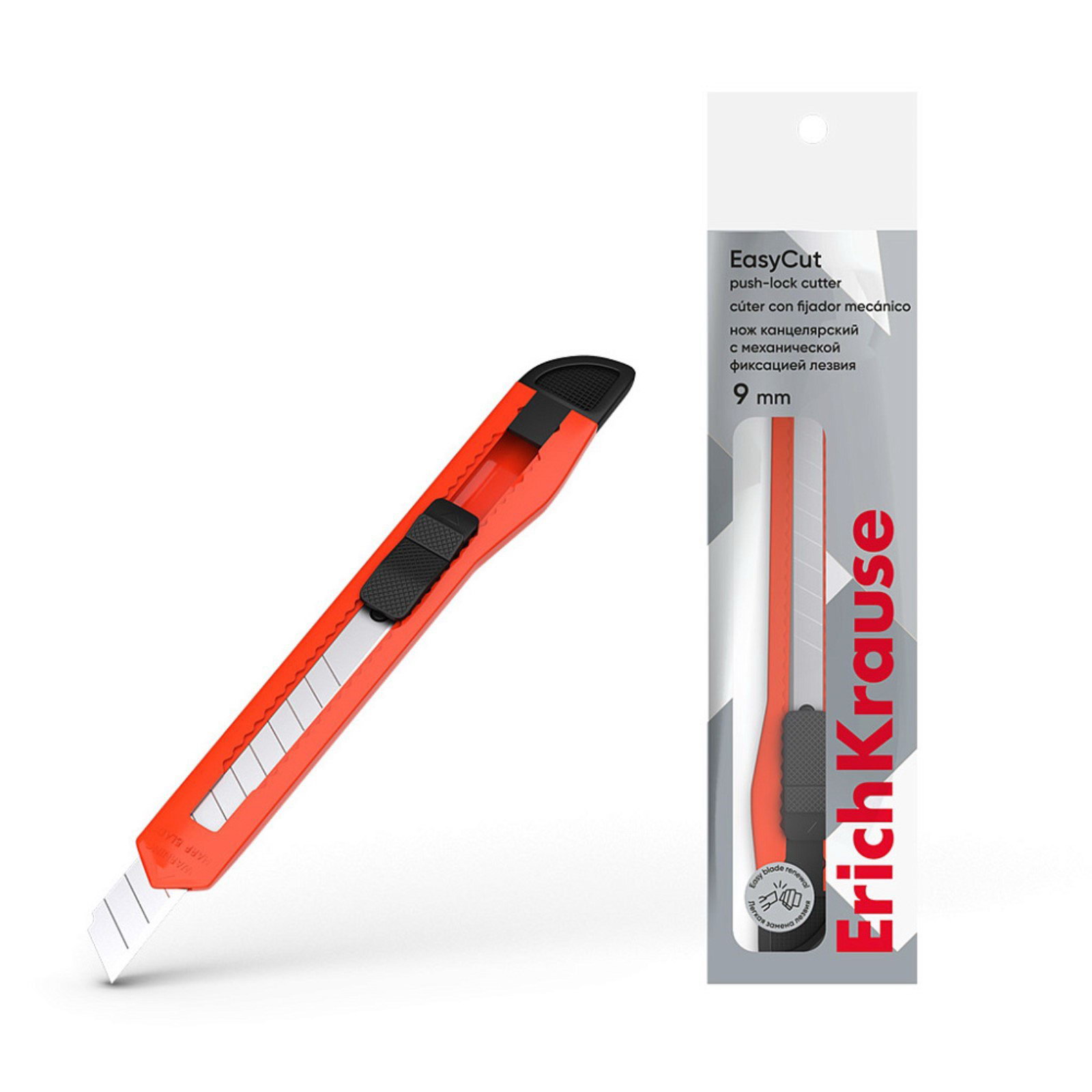 Нож канцелярский 9 мм, Erich Krause STANDARD, с системой фиксации лезвия push-lock и насадкой для безопасного отделения сегмента лезвия, МИКС, 2x0.4x13 см., ErichKrause, Китай