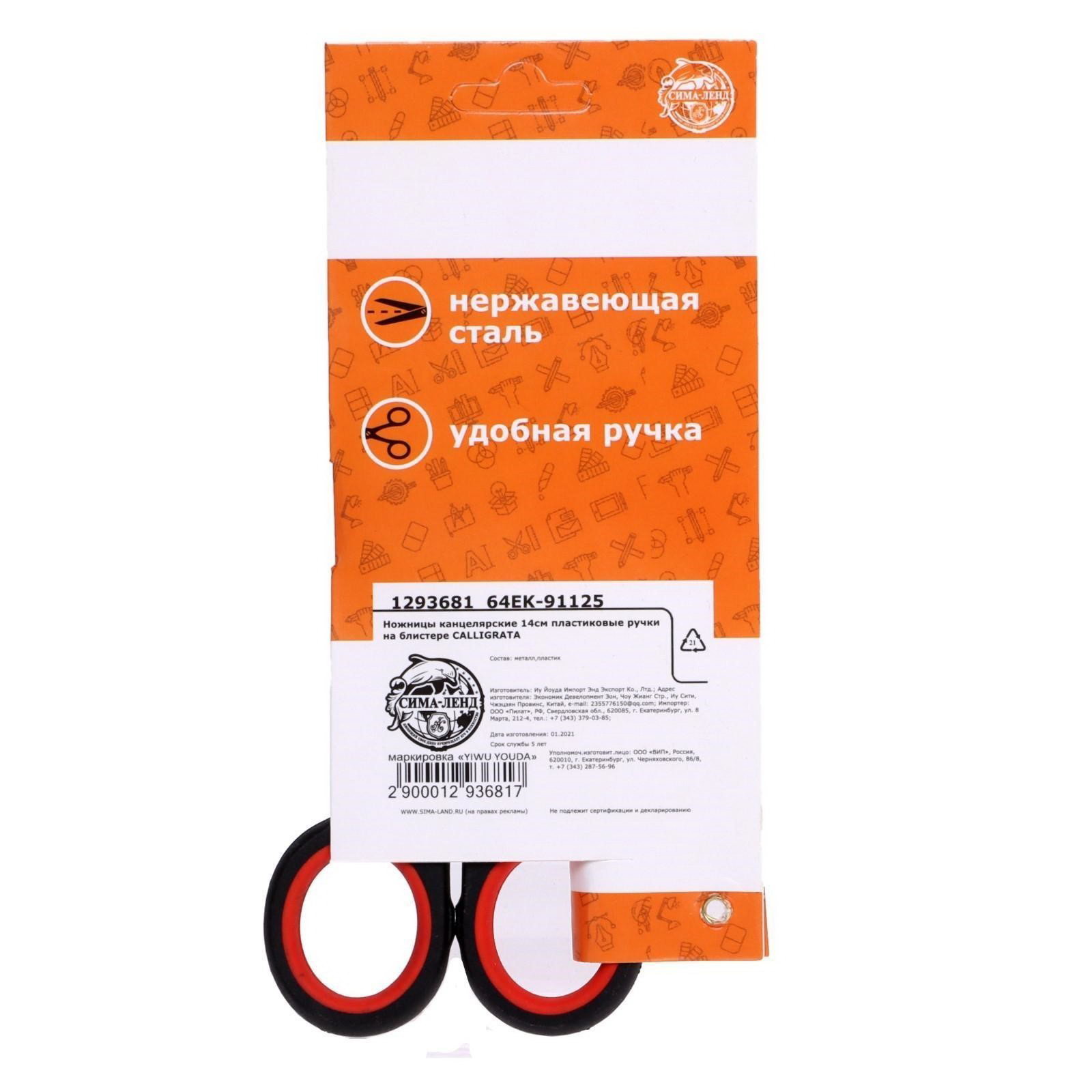 Ножницы канцелярские 14 см, пластиковые ручки, блистер, 7x1x14 см., Calligrata, Китай