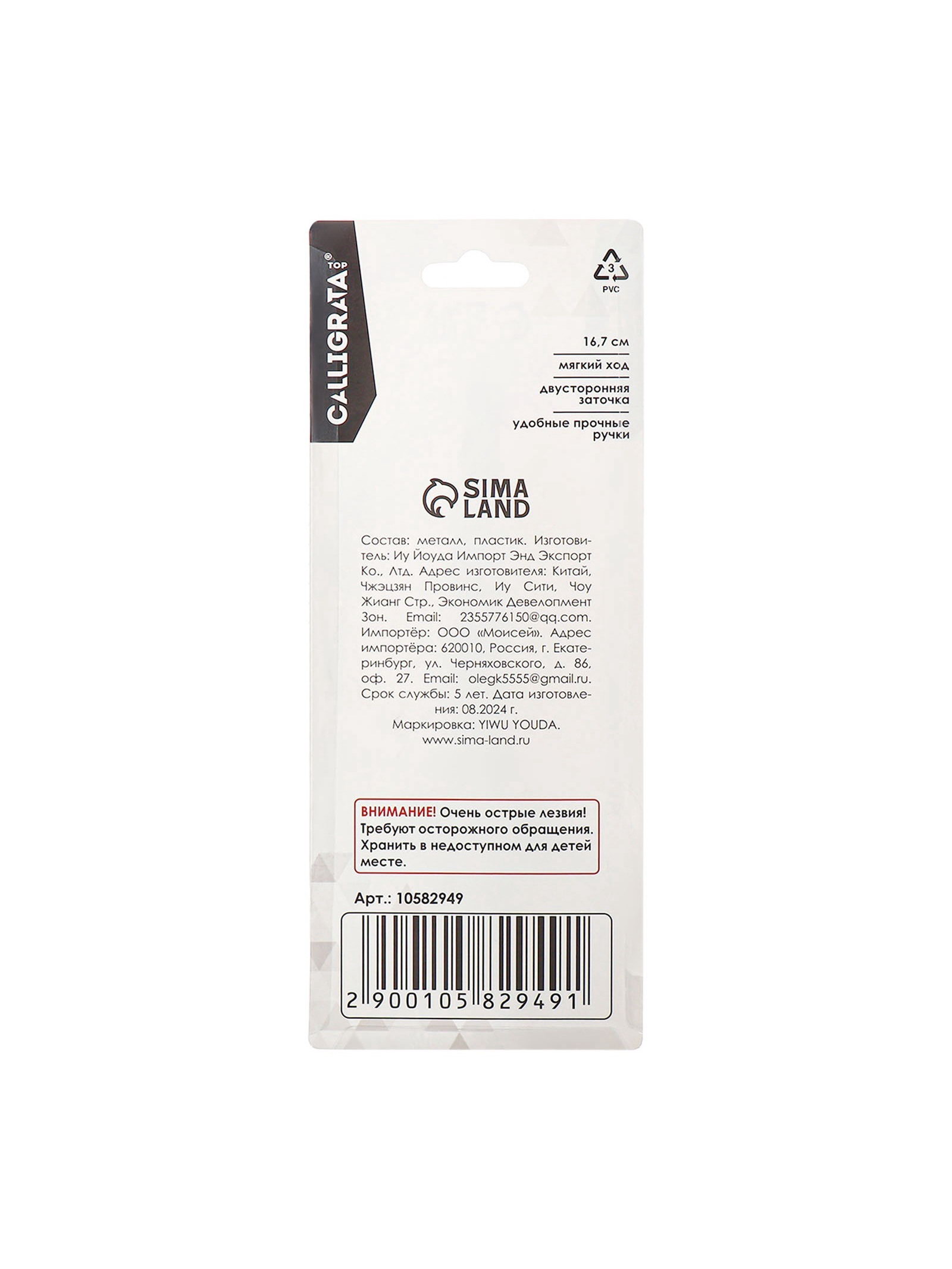 Ножницы канцелярские 16.7 см, Офис, пластиковые ручки, европодвес, 6.8x16.7x0.7 см., Calligrata TOP, Китай
