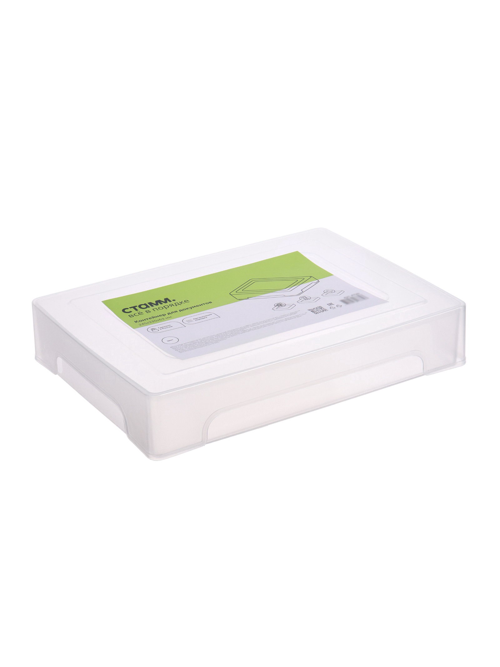 Размер упаковки: 23.5 x 6 x 32 см. Тип: Горизонтальный Цвет: Прозрачный Реестр Минпромторга: Да tnved: 3926100000 Количество секций: 1 Штрихкод на единице товара: Да Европодвес: Нет Вид: Контейнер Колёса/ролики: Нет Ширина, см: 390 Рисунок: Нет Крышка: Да Высота, см: 6 Глубина, см: 23.5 Температурное ограничение транспортировки: Да Контейнер с крышкой предназначен для хранения документации формата А4. Прочный, вместительный корпус 245 x 330 x 63 мм Упаковка: пакет с цветным вкладышем.