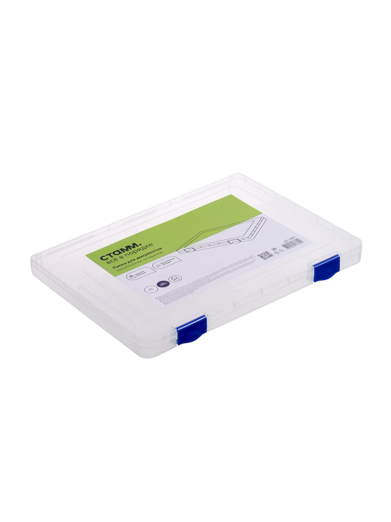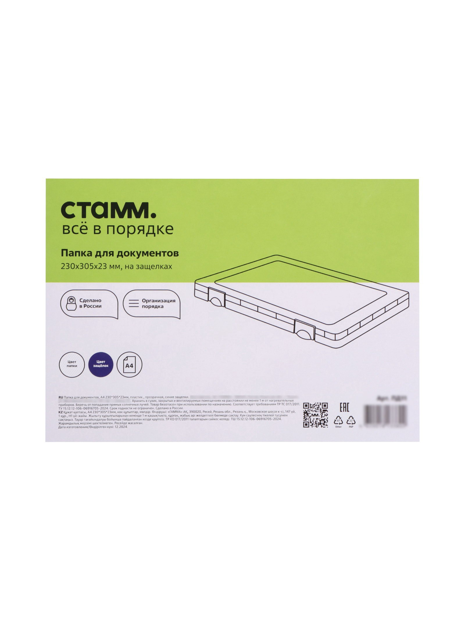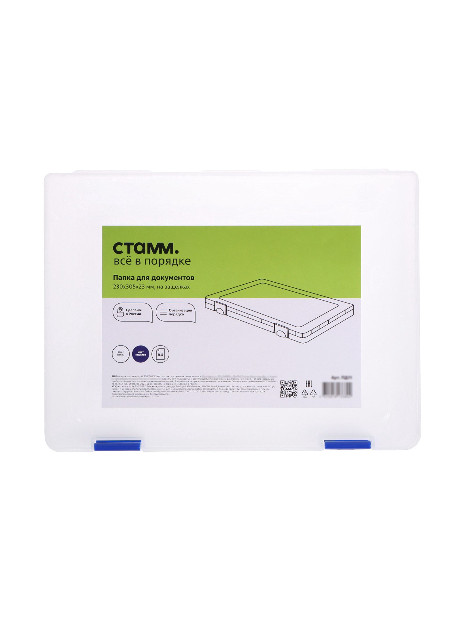 Папка для документов А4 230x305x23 мм, пластик, прозрачный корпус, синие защелки, Стамм, Россия