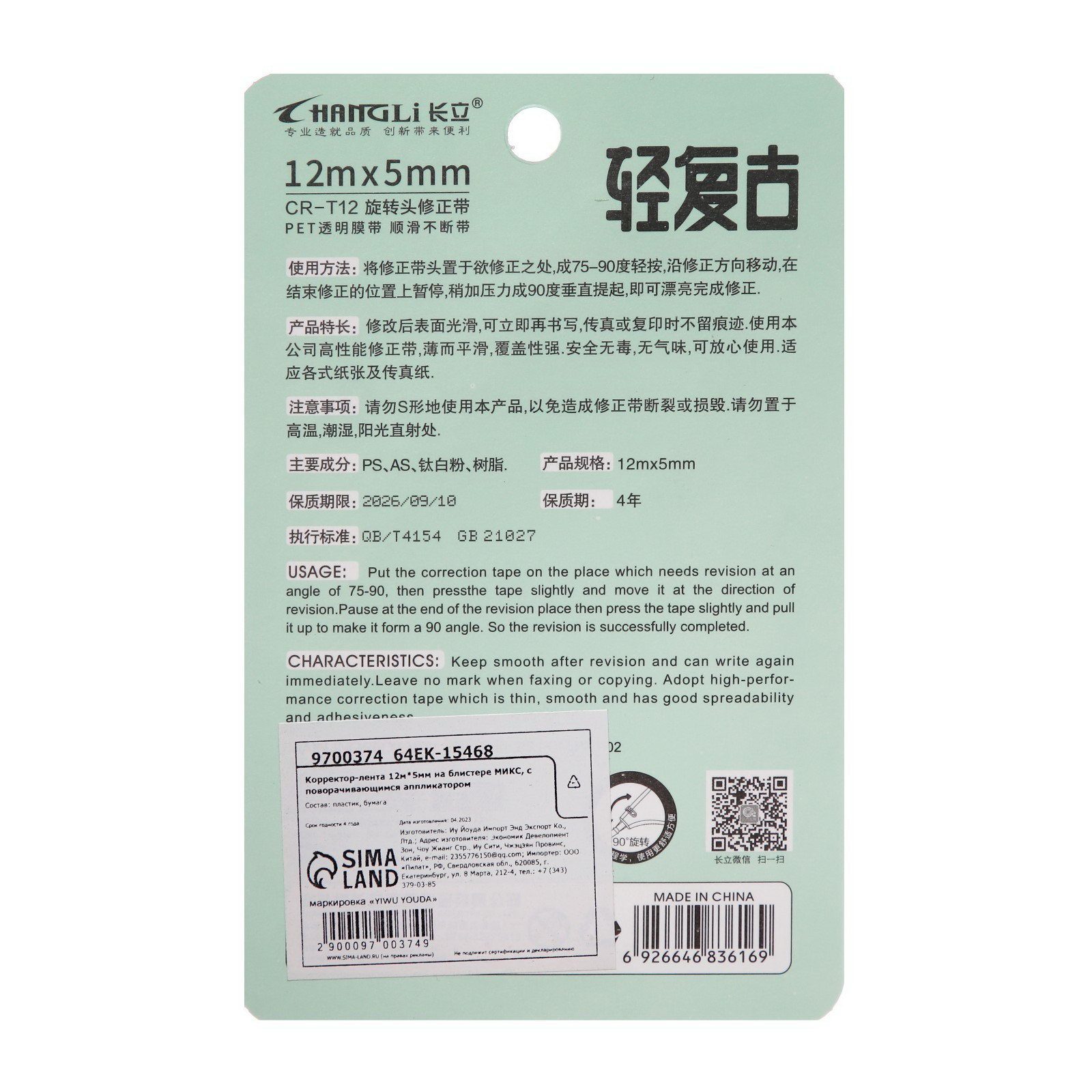 Корректор-лента 12м x 5мм, с поворачивающимся аппликатором, МИКС, Китай