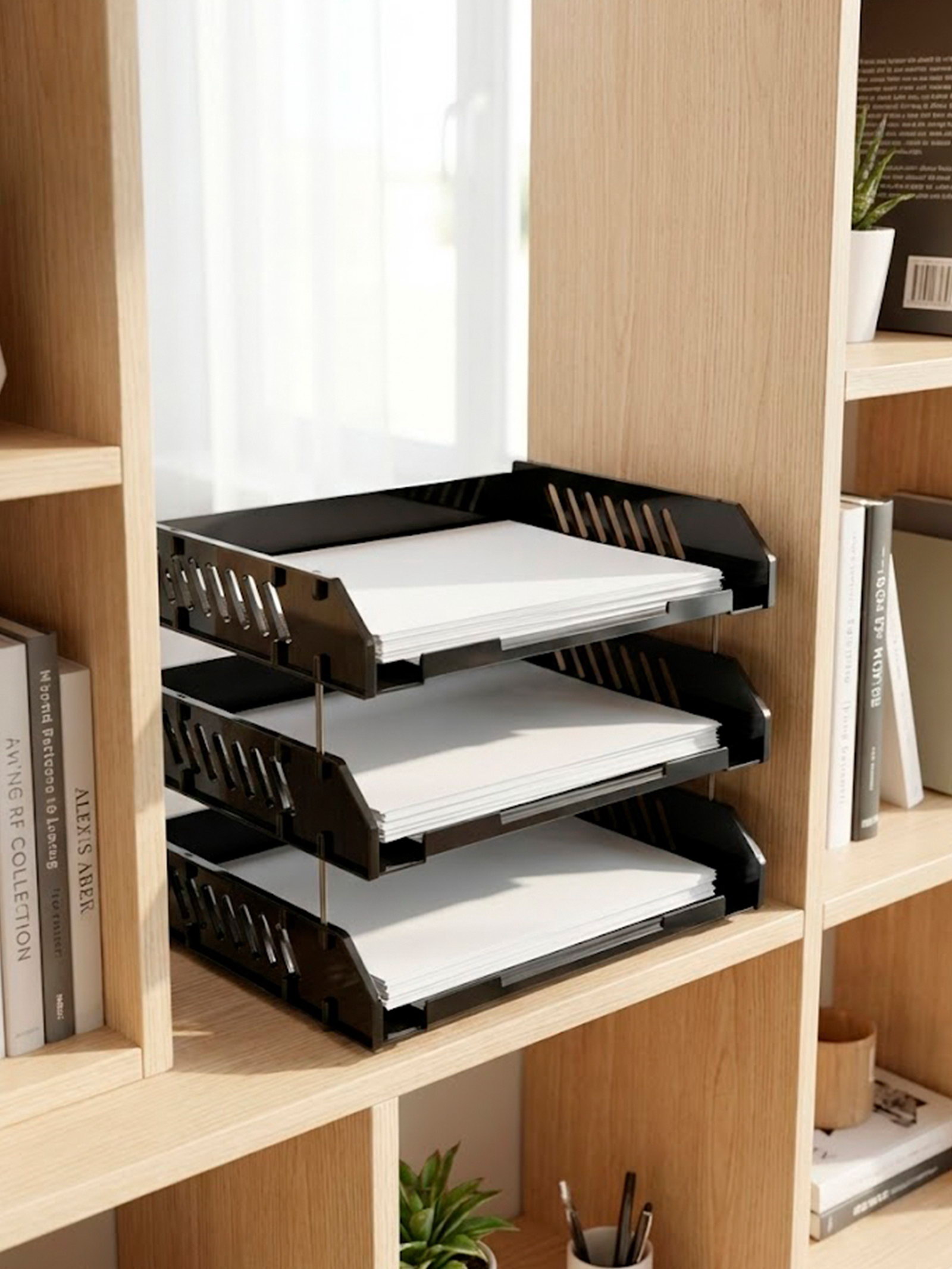 Лотки надёжно стыкуются друг с другом металлическими стержнями 6см. Вместительная и прочная конструкция. Гладкая поверхность. Вместительные горизонтальные лоток для листов в формате А4. Упакованы в термопленку с цветным вкладышем.