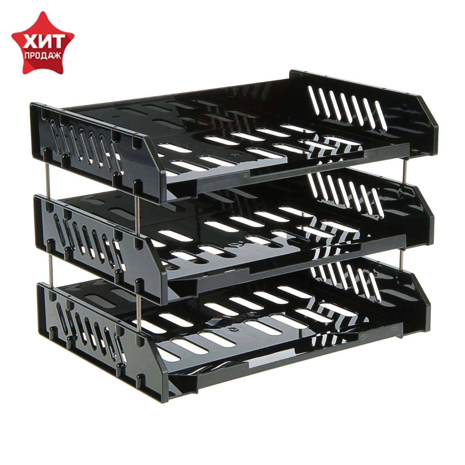 Набор лотков для бумаг "Сити", А4, горизонтальный, на металлических стержнях, 3 отделения, чёрный, Стамм, Россия