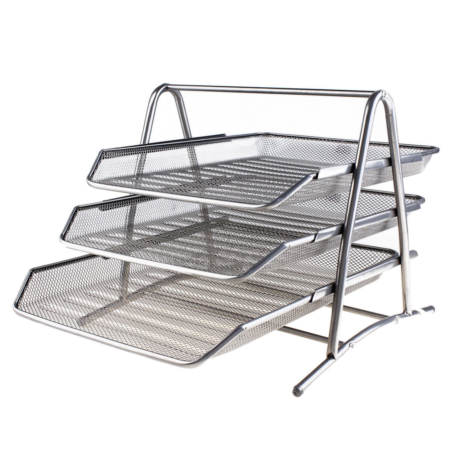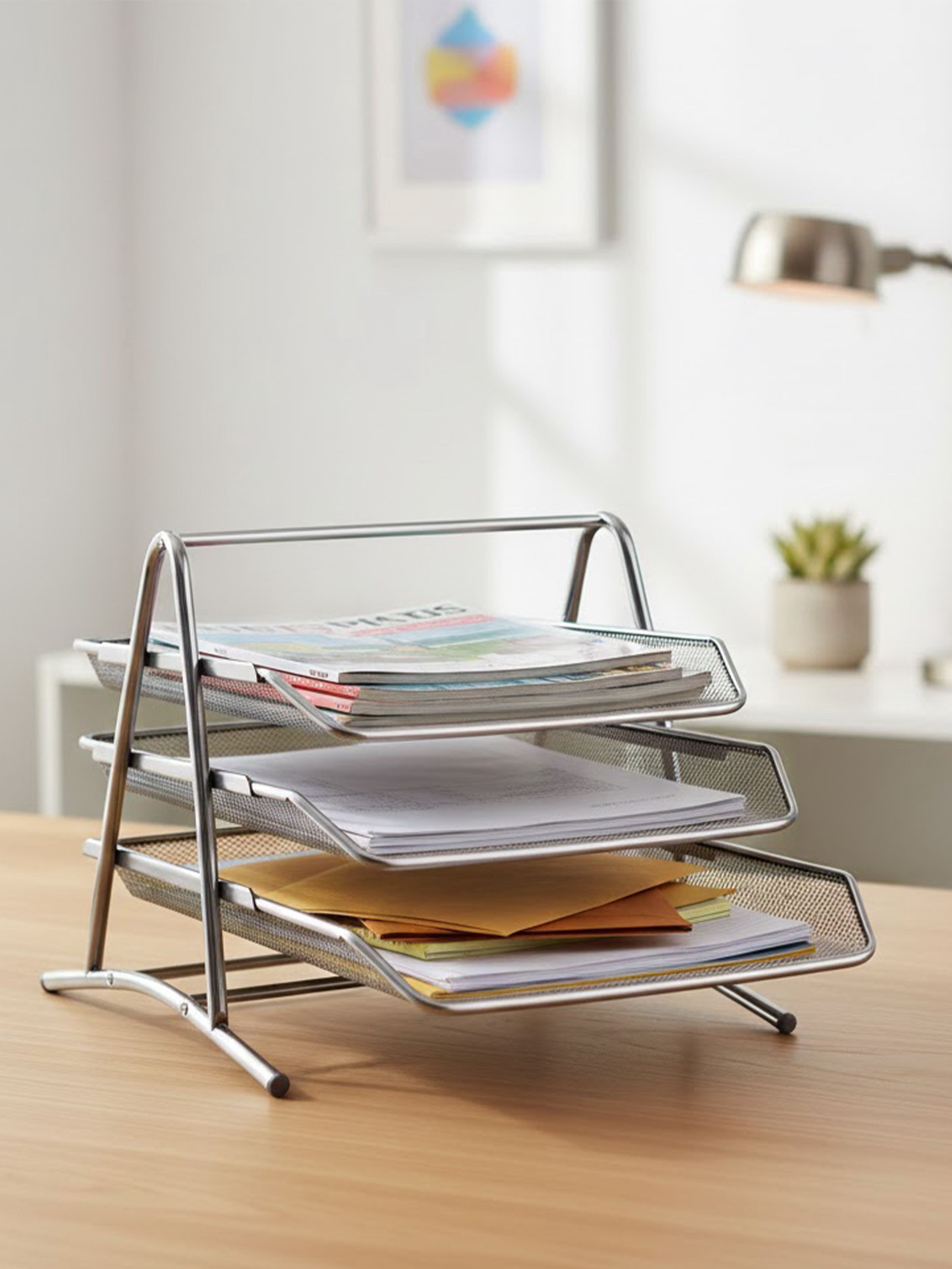Разделите ваш рабочий процесс на три простых этапа. Этот горизонтальный лоток из серой металлической сетки с тремя отделениями помогает организовать документы по степени важности, срочности или типу задач. Его прочная, но визуально лёгкая конструкция привносит на рабочий стол порядок и современный стиль, не создавая ощущения громоздкости. Особенности